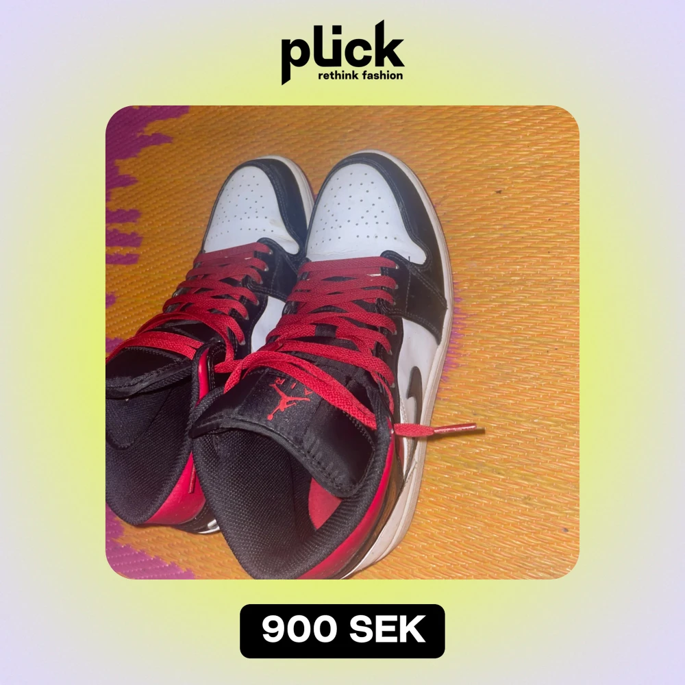 Säljer ett par snygga Nike Air Jordans i svart, vitt och rött. Skorna har en klassisk design med röd snörning och den ikoniska Nike-loggan på sidan. Perfekta för både vardag och fest. De är i bra skick och redo för nya äventyr!