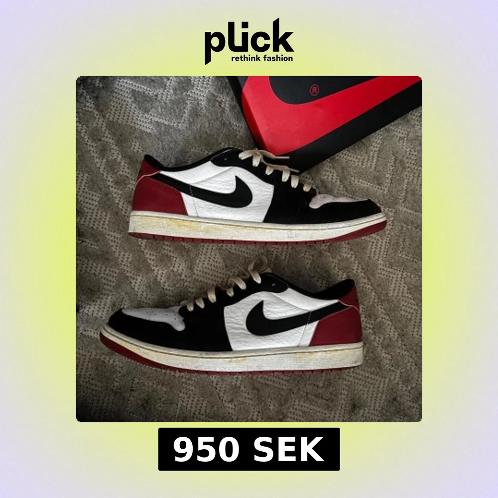 Nike Air Jordan 1 Low OG i färgen Black Toe. Skorna har svart swoosh, vit tåbox och sidopanel, röda hälpartier och svarta detaljer. Klassisk låg modell med snörning och perforerad tå. Perfekta för dig som gillar streetwear och sneakerskultur.