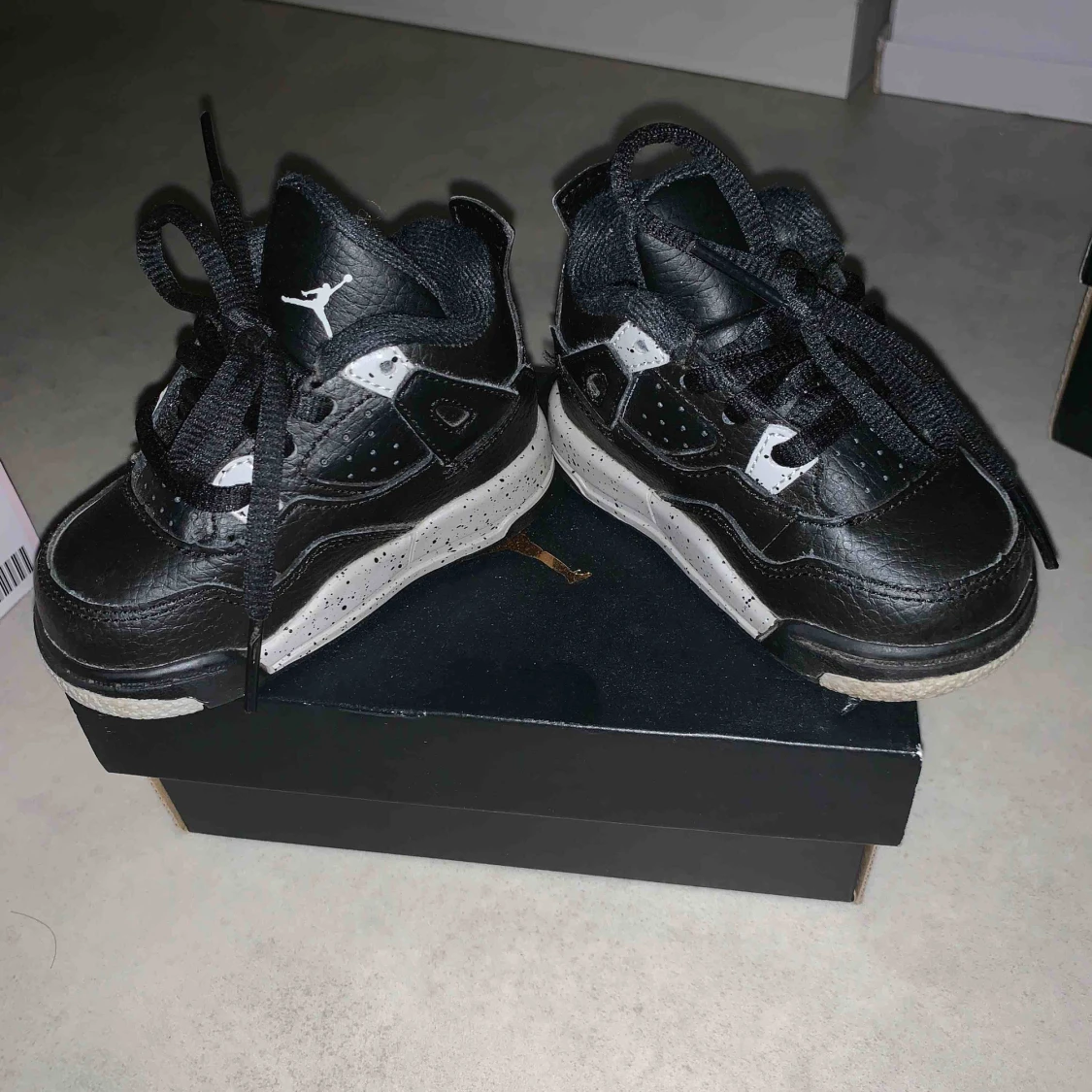 Jordan 4 retro oreo, storlek 19,5 10cm. Använt 1-2 gånger fortfarande som ny.
