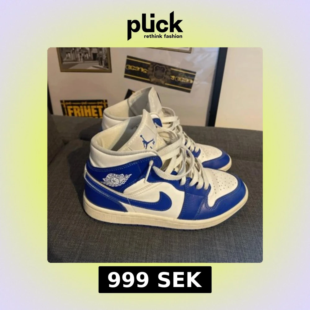 Säljer ett par Nike Air Jordan 1 sneakers i blått och vitt skinn. Klassisk high-top modell med snörning, perforerad tå och ikoniska Jordan Wings-loggan på sidan. Perfekta för dig som vill sticka ut med en retro basketstil.