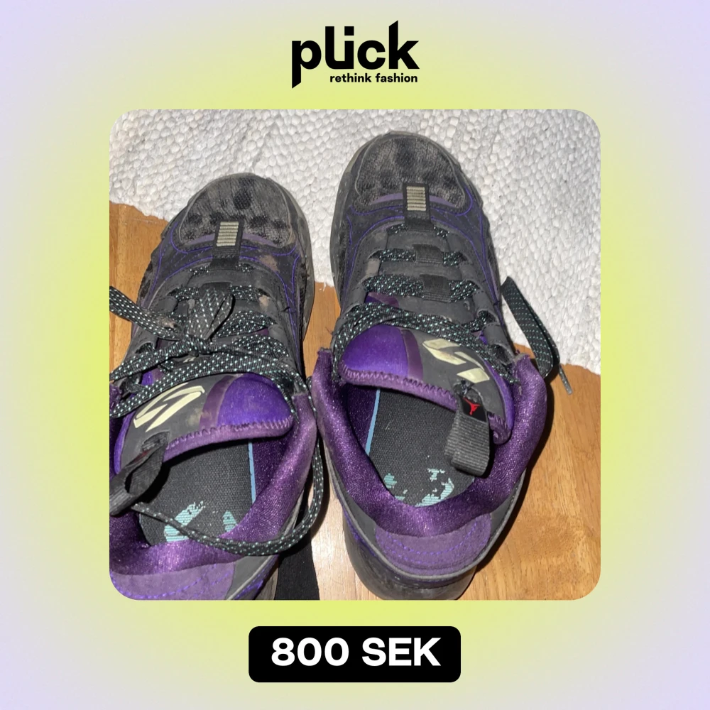 Säljer ett par coola svarta sneakers med lila detaljer och snörning. De har en unik design med turkosa stänk på sidorna och en slitstark sula. Perfekta för vardagsbruk eller träning. Skorna är i bra skick men har lite slitage på sulan.