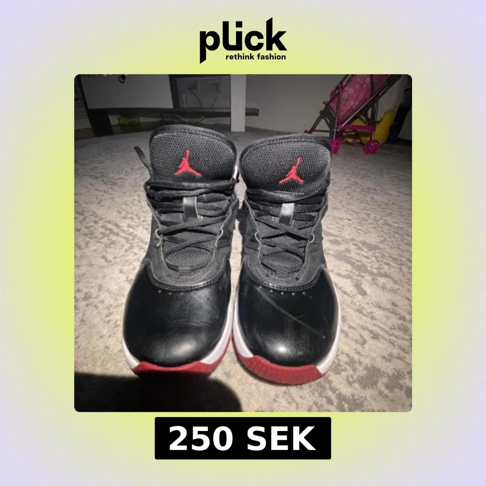 Säljer ett par svarta Nike Air Jordans med röda detaljer och vit sula. Skorna har snörning, rund tå och är tillverkade i syntetmaterial med meshpartier för extra andningsförmåga. Perfekta för dig som gillar streetwear och sneakers med ikonisk design.