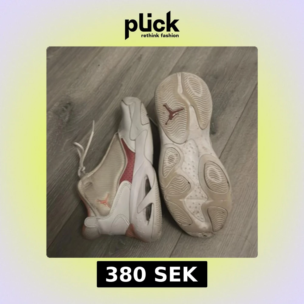 Snygga vita och rosa sneakers från Jordan med snörning och en stilren design. Skorna har en mjuk rosa insida och en vit yttersula med rosa detaljer. Perfekta för en sportig look.