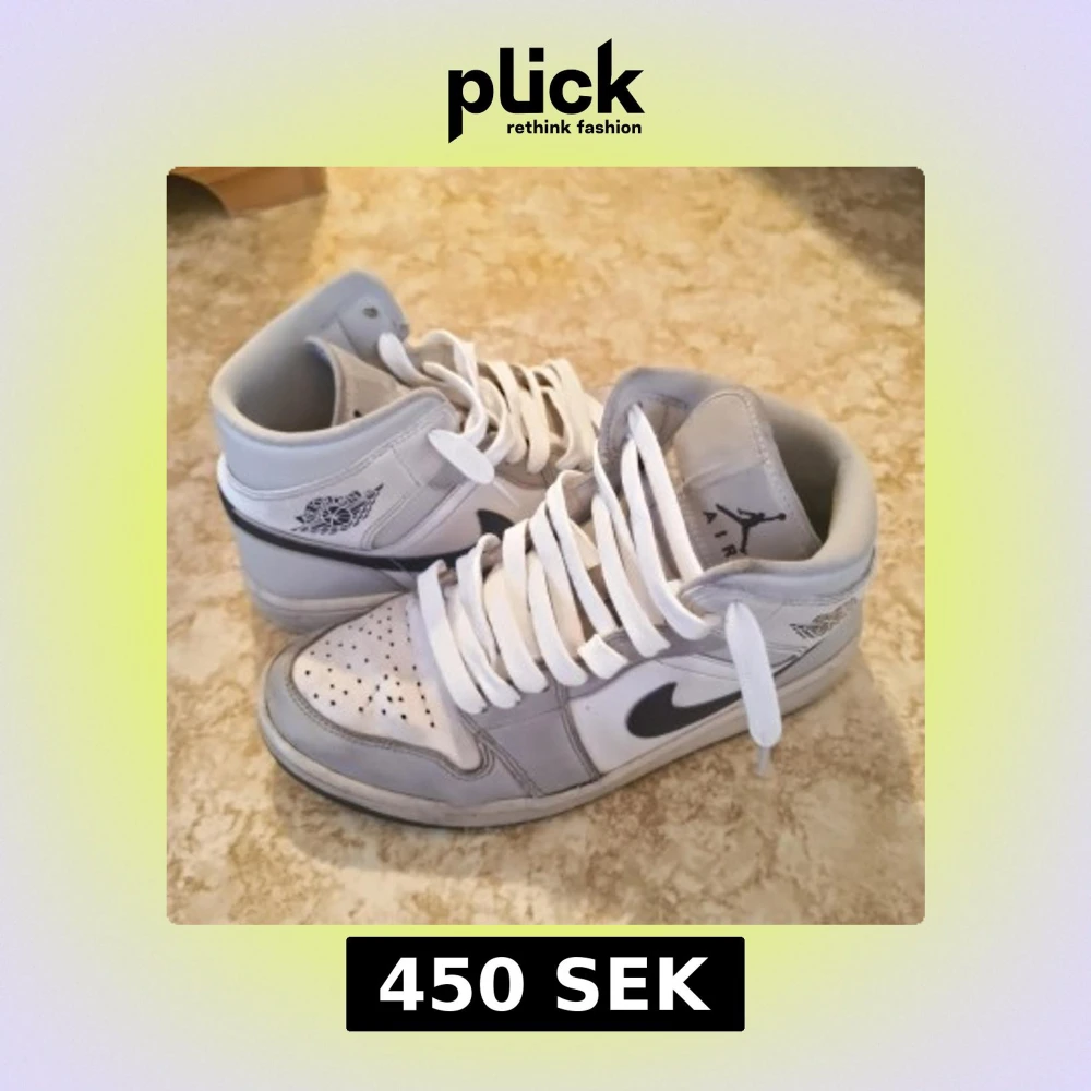 Säljer ett par Nike Air Jordan 1 miss sneakers i grått och vitt med svarta detaljer. Normal i storleken men passar även för folk med storlek 41.