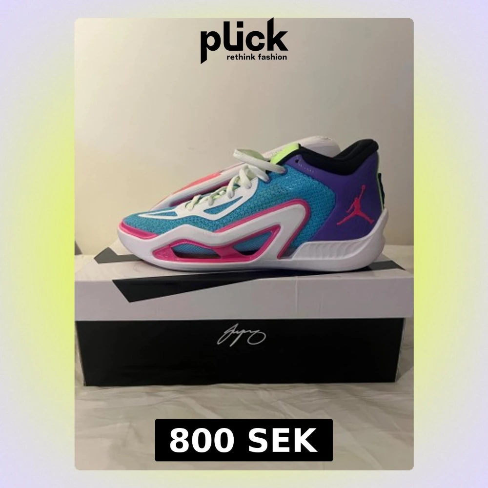 Säljer ett par färgstarka Jordan JT sneakers med mesh-överdel i blått, detaljer i vitt och neonrosa samt lila hälparti med rosa Jumpman-logga. Tungan är limegrön med JT-tryck och palmträd. Sulan är vit med rosa och lime detaljer, och skorna har snörning för perfekt passform.