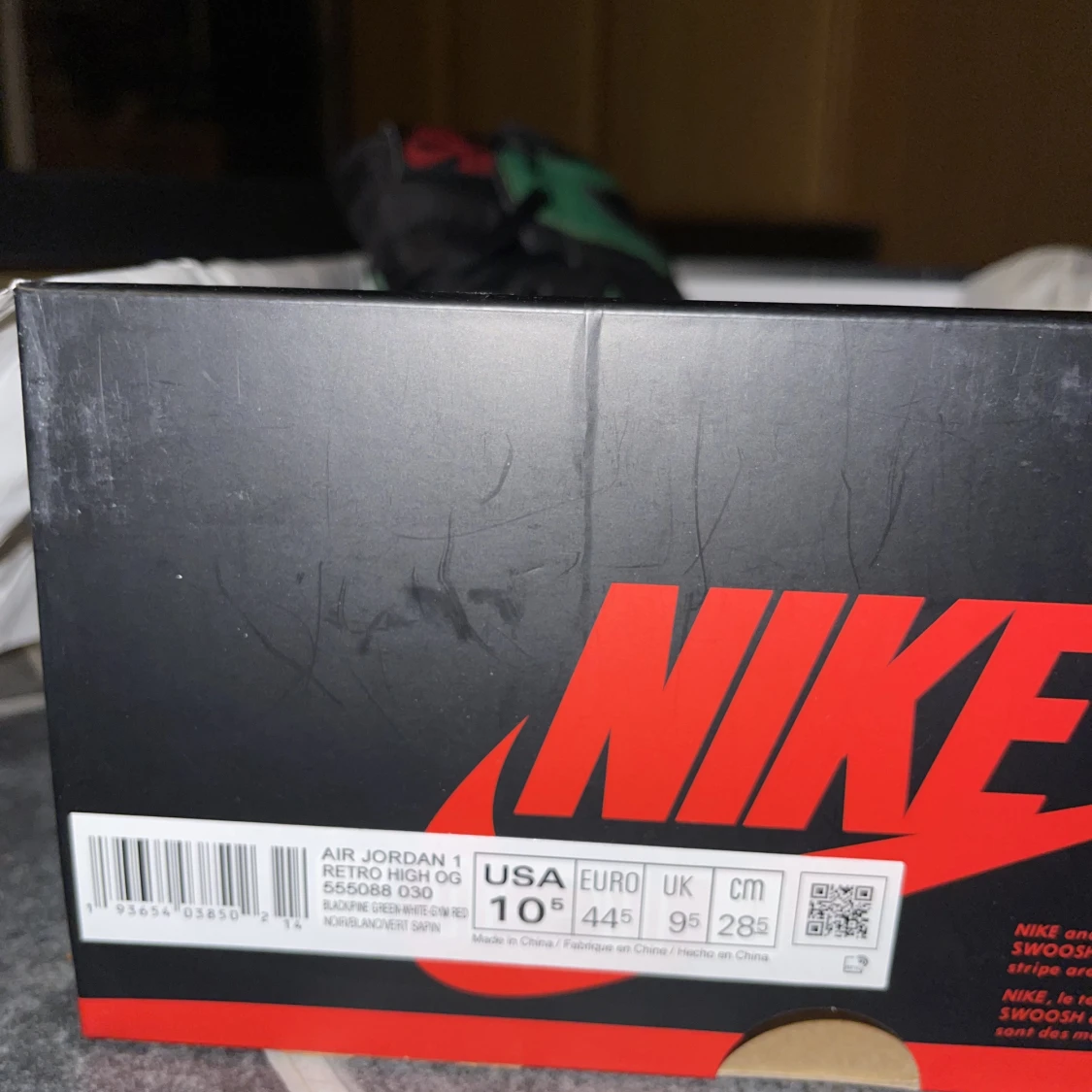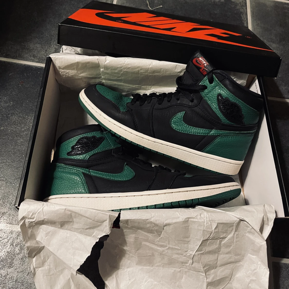 Säljer nu mina air Jordan 1 Retro high Pine green, aldrig använda utomhus bara testade med ena foten inomhus, i ny skick priset är prutat och klart ✅ Kontakt uppgifter 0723977830