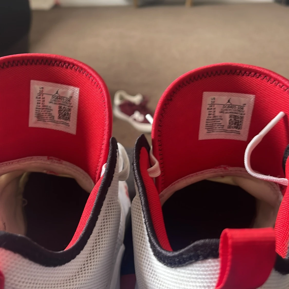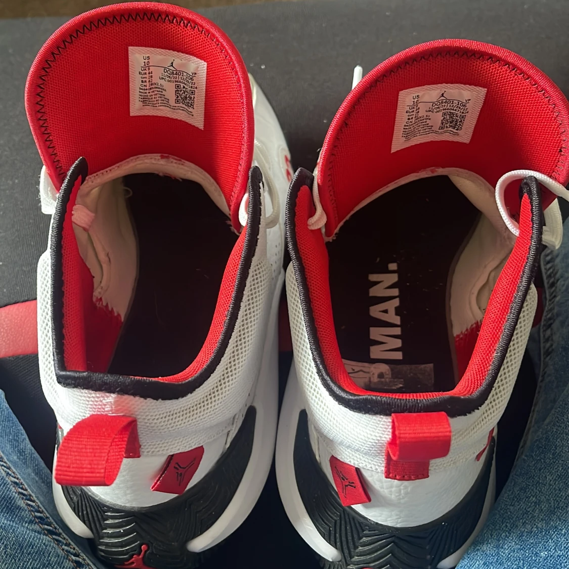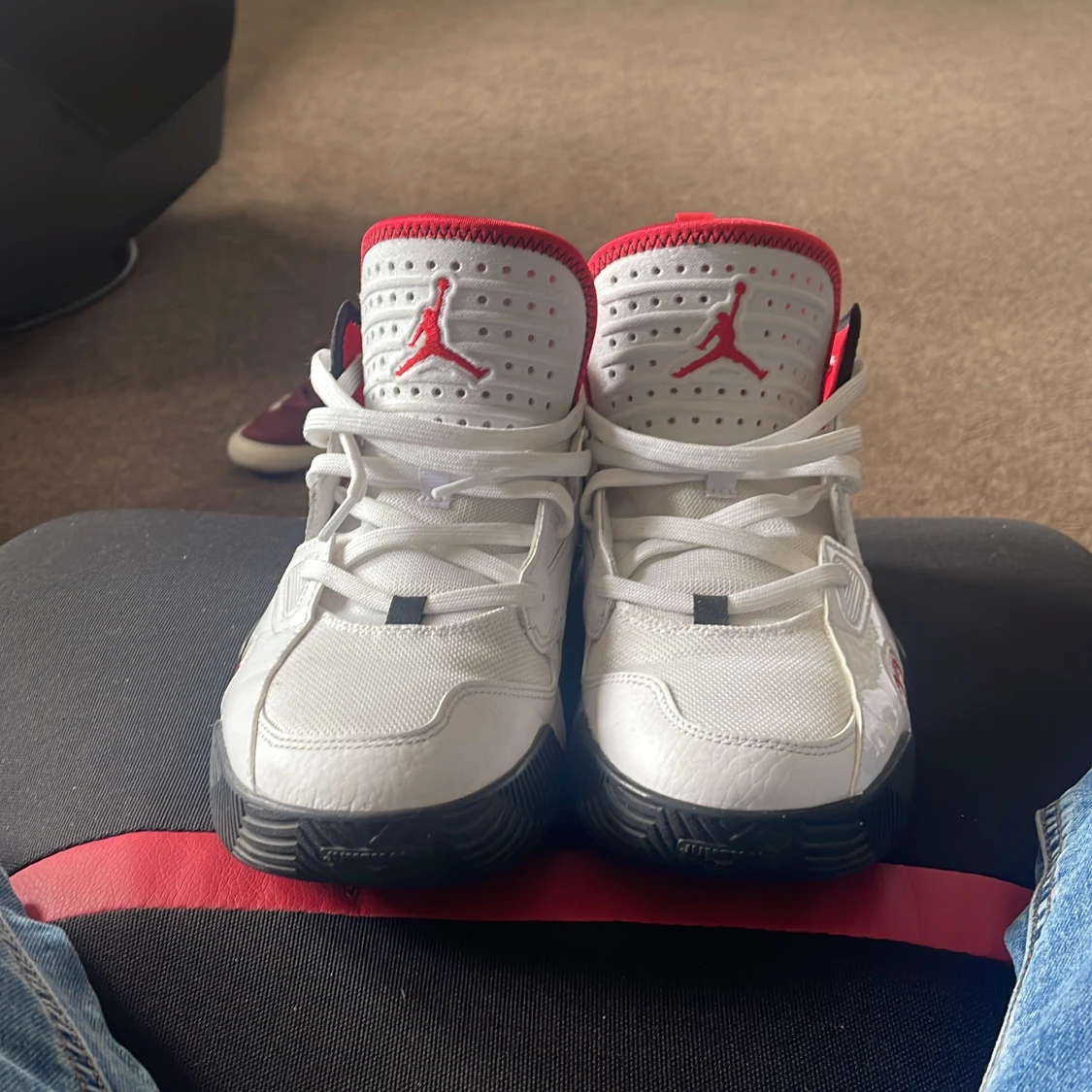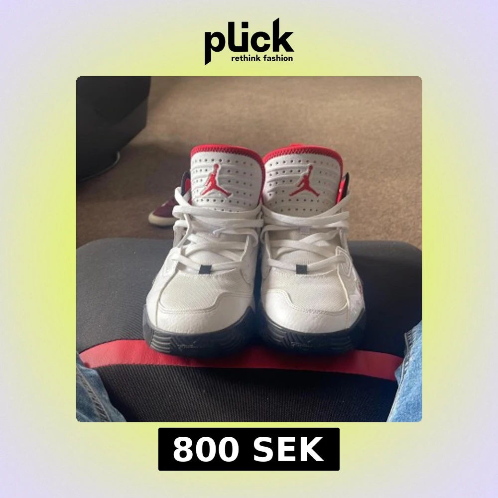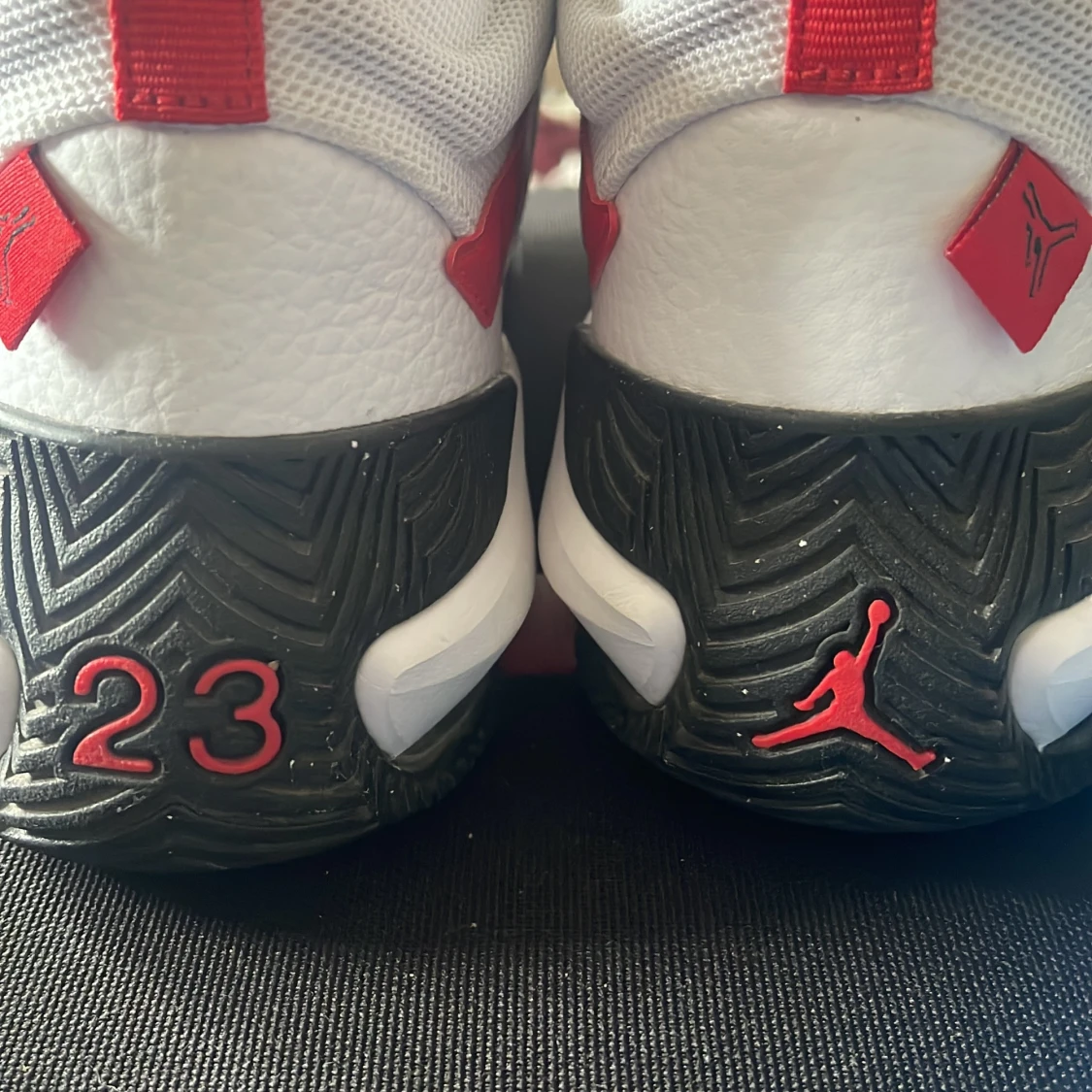Säljer ett par Nike Air Jordan 23 sneakers i vitt med röda och svarta detaljer. Skorna har klassisk snörning, perforerad tå och svart yttersula med röd Jumpman-logga. Ovandelen är i syntet och mesh för en sportig vibe. Perfekta för dig som gillar streetstyle. Bara skor följer med vi köp av skorna