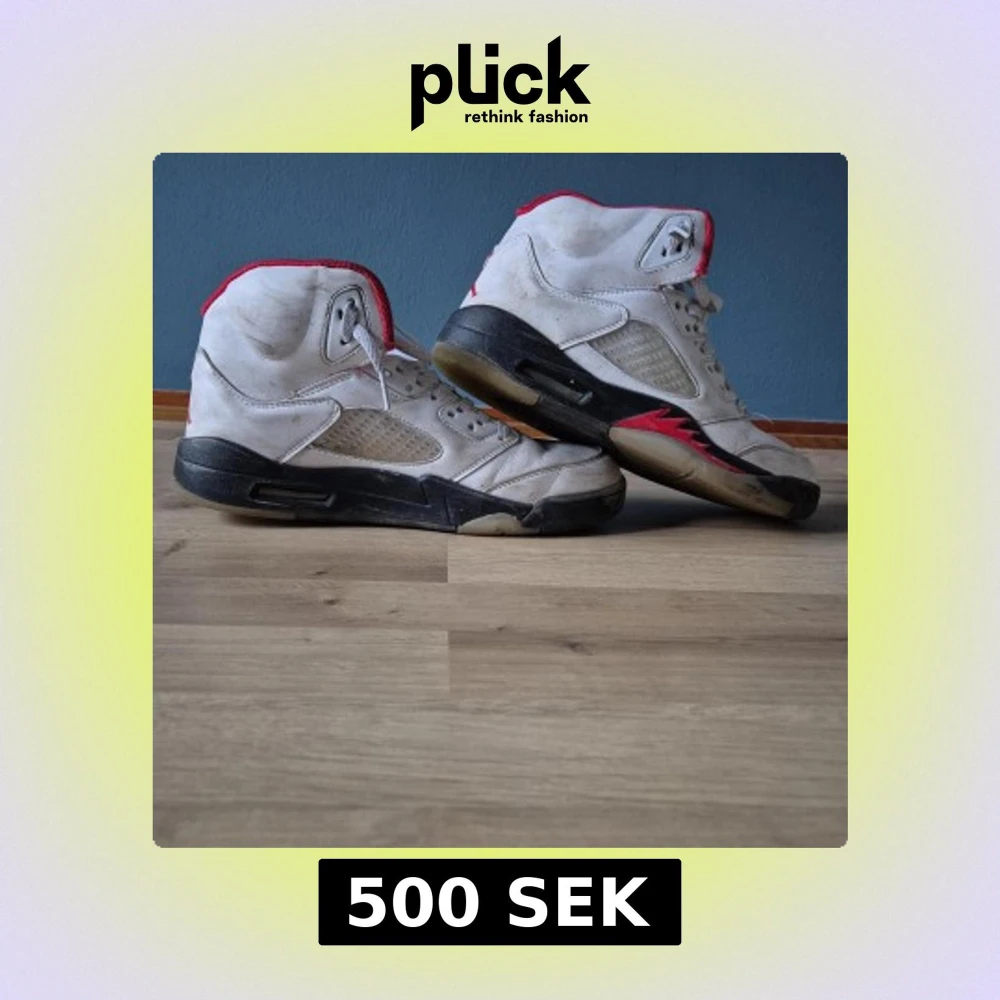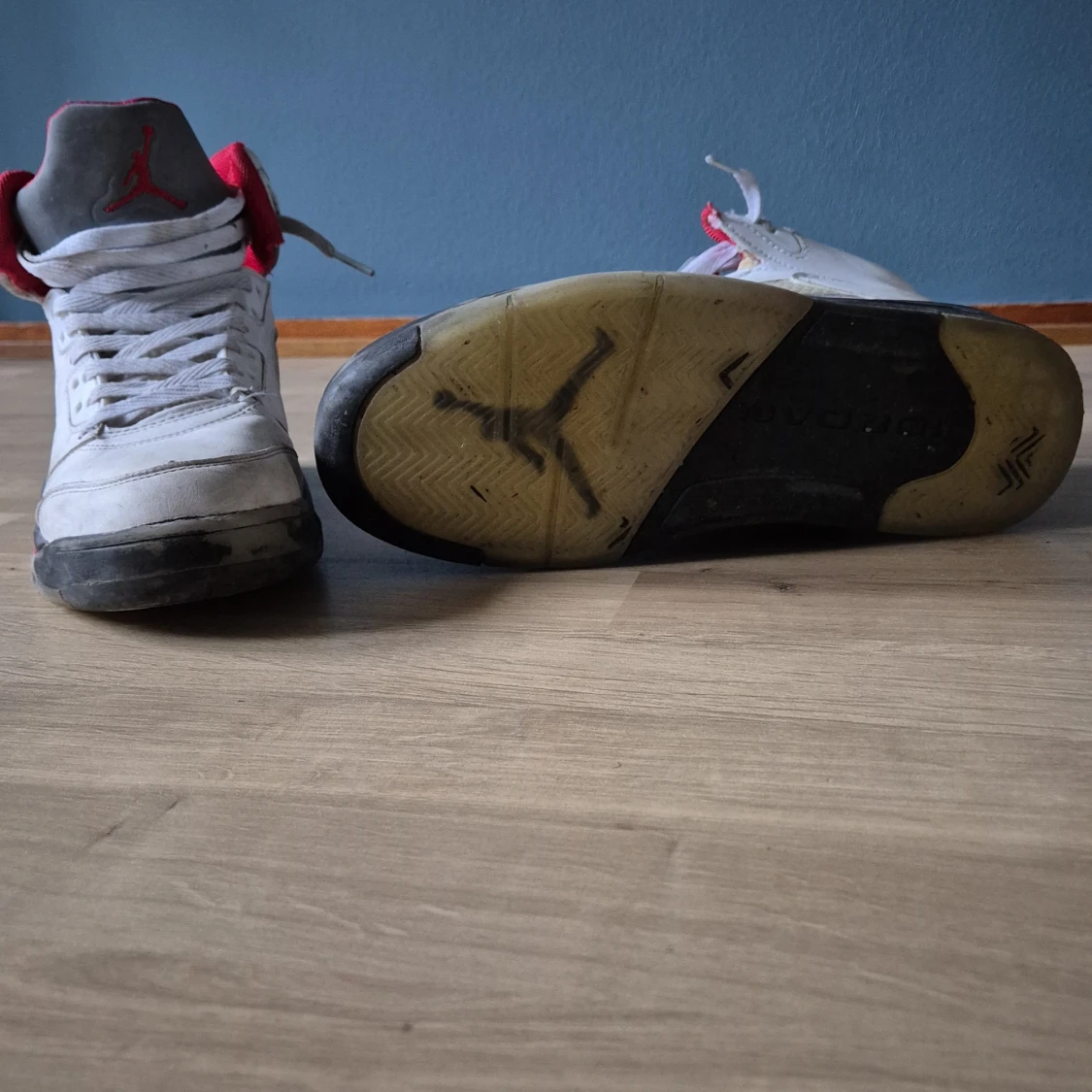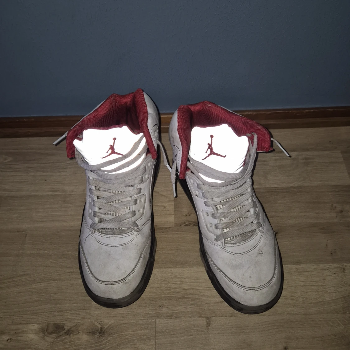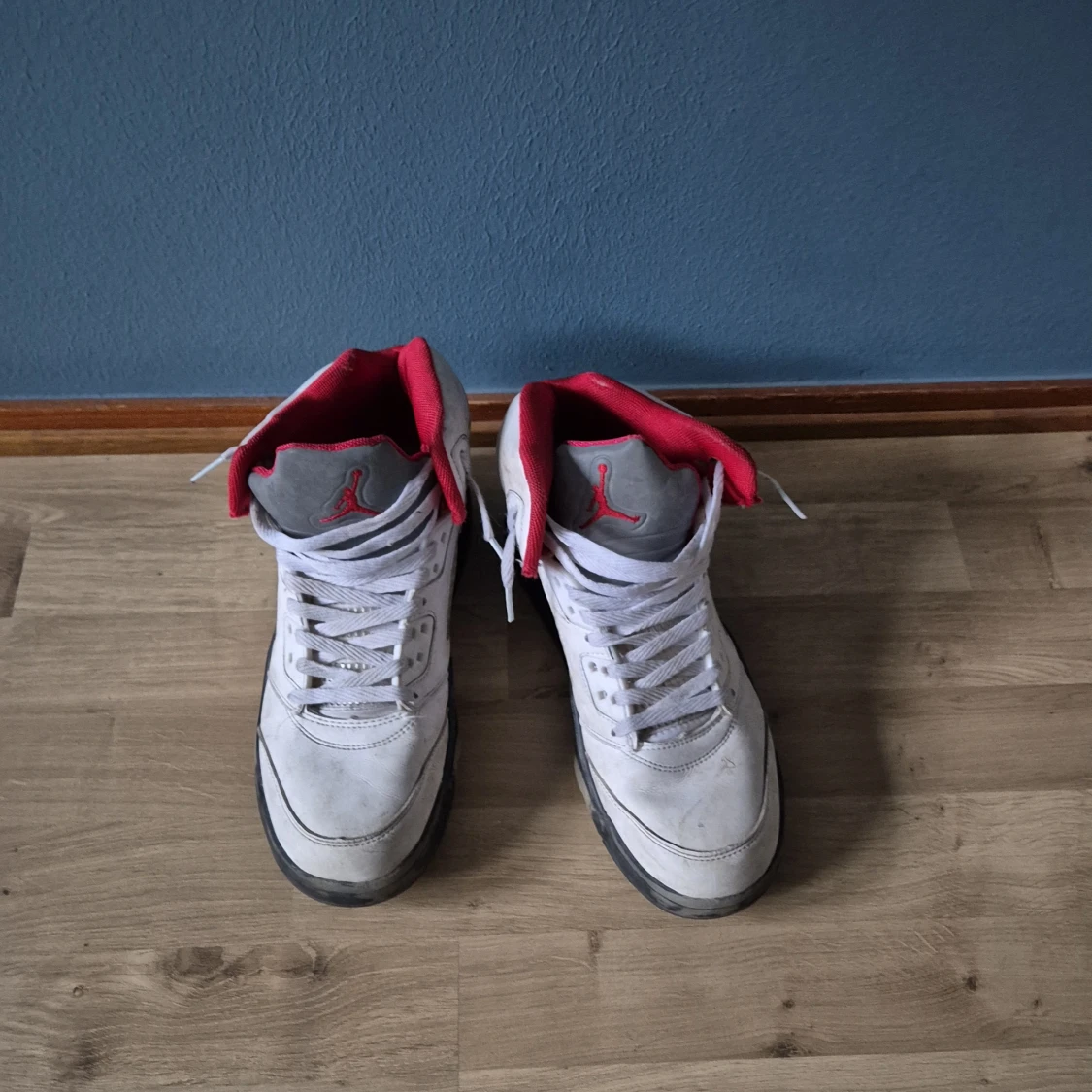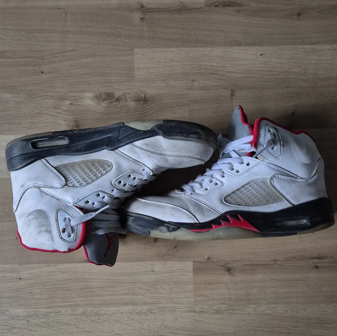 Säljer ett par klassiska Air Jordans 5 i vitt med röda detaljer och svart sula. Skorna har snörning, meshpaneler på sidorna och rund tå. Perfekta för dig som gillar retrostil och streetwear.