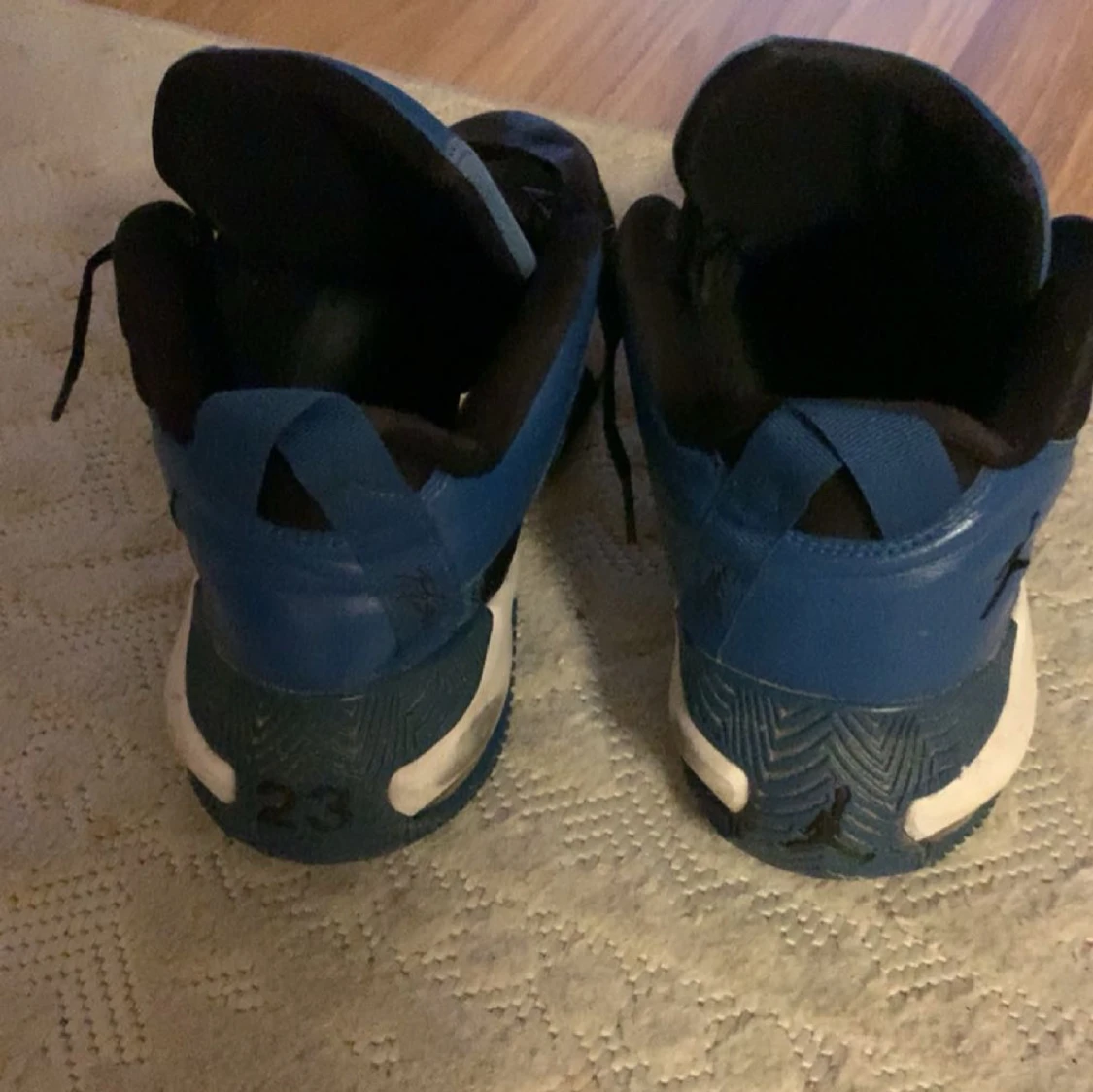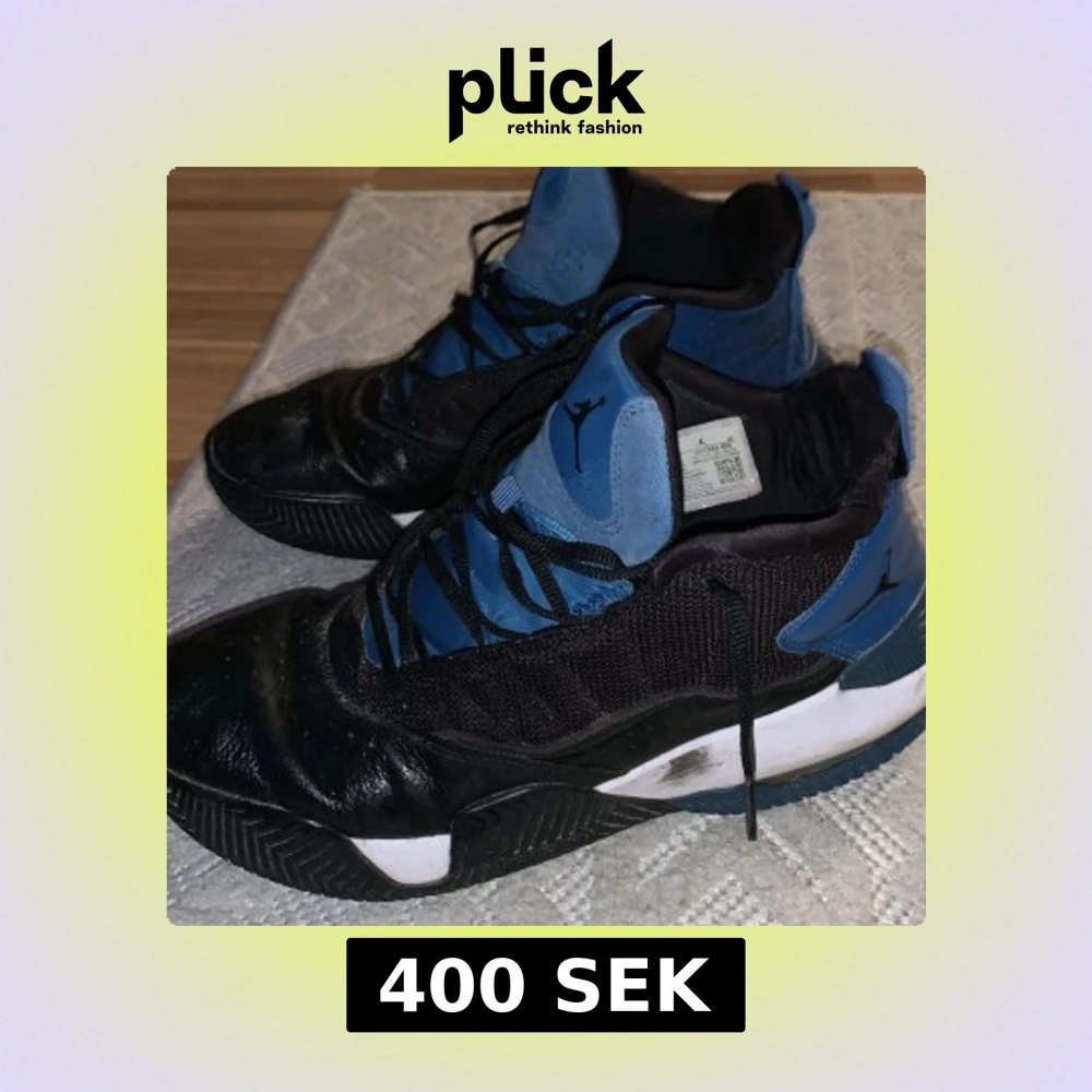 Säljer ett par feta Jordan sneakers i svart och blått med coola detaljer och Jumpman-logga på tungan och hälen. Skorna har snörning, robust sula och är tillverkade i en mix av skinn och syntetmaterial. Perfekta för dig som gillar streetstyle och basketvibe.