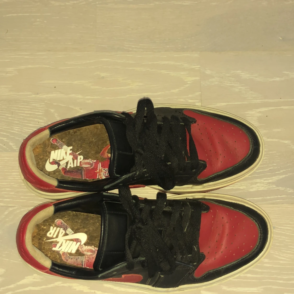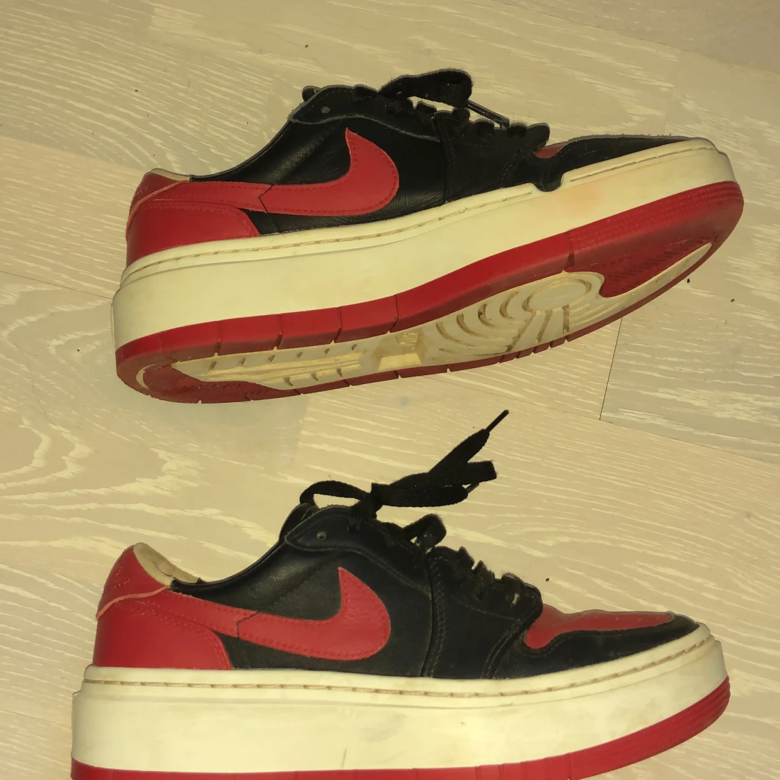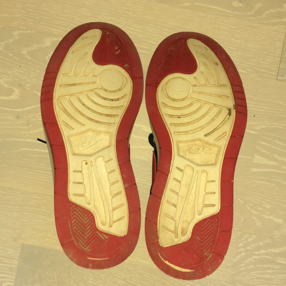 Ett par Jordans i storlek 40,5. Ganska bra skick inte använda super många gånger kommer med ett par röda snören med
