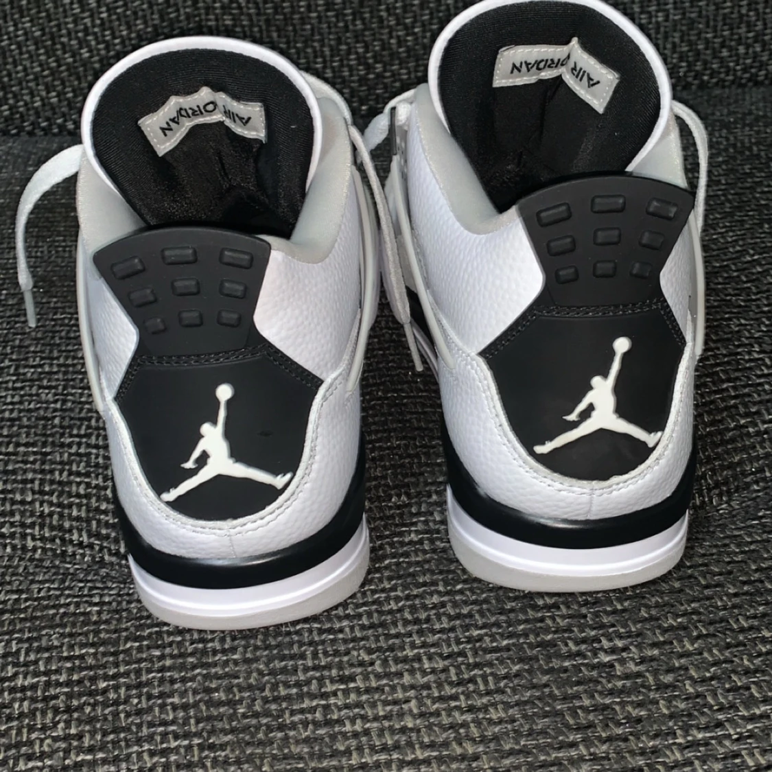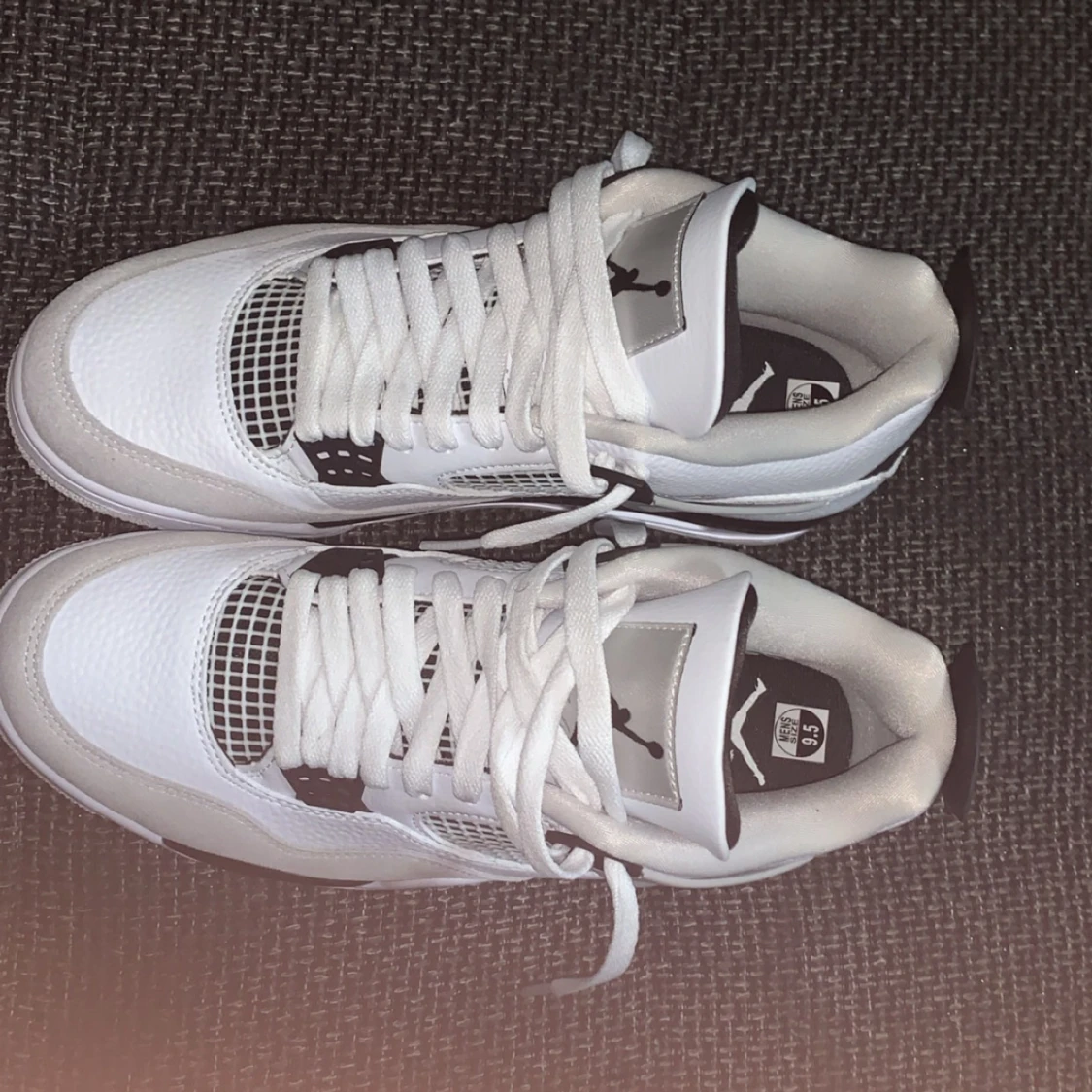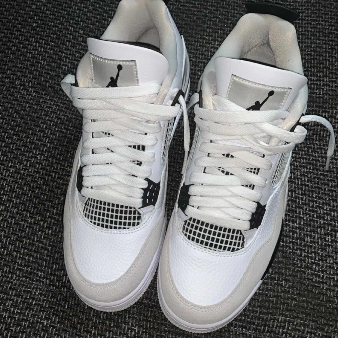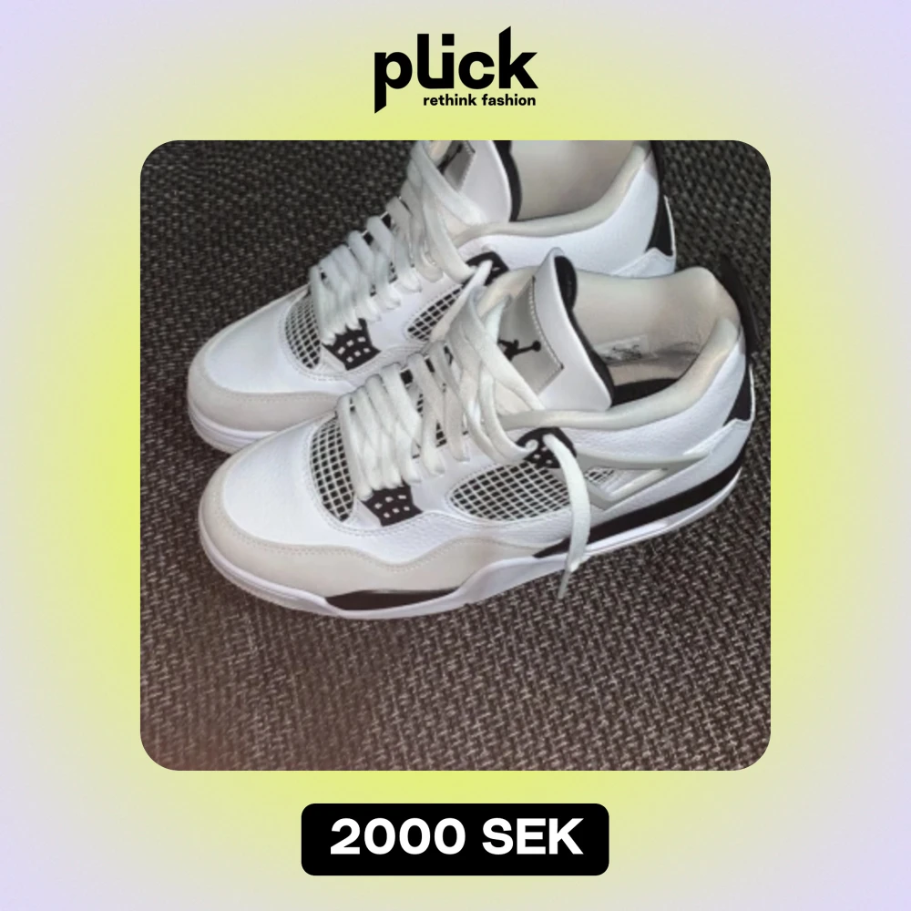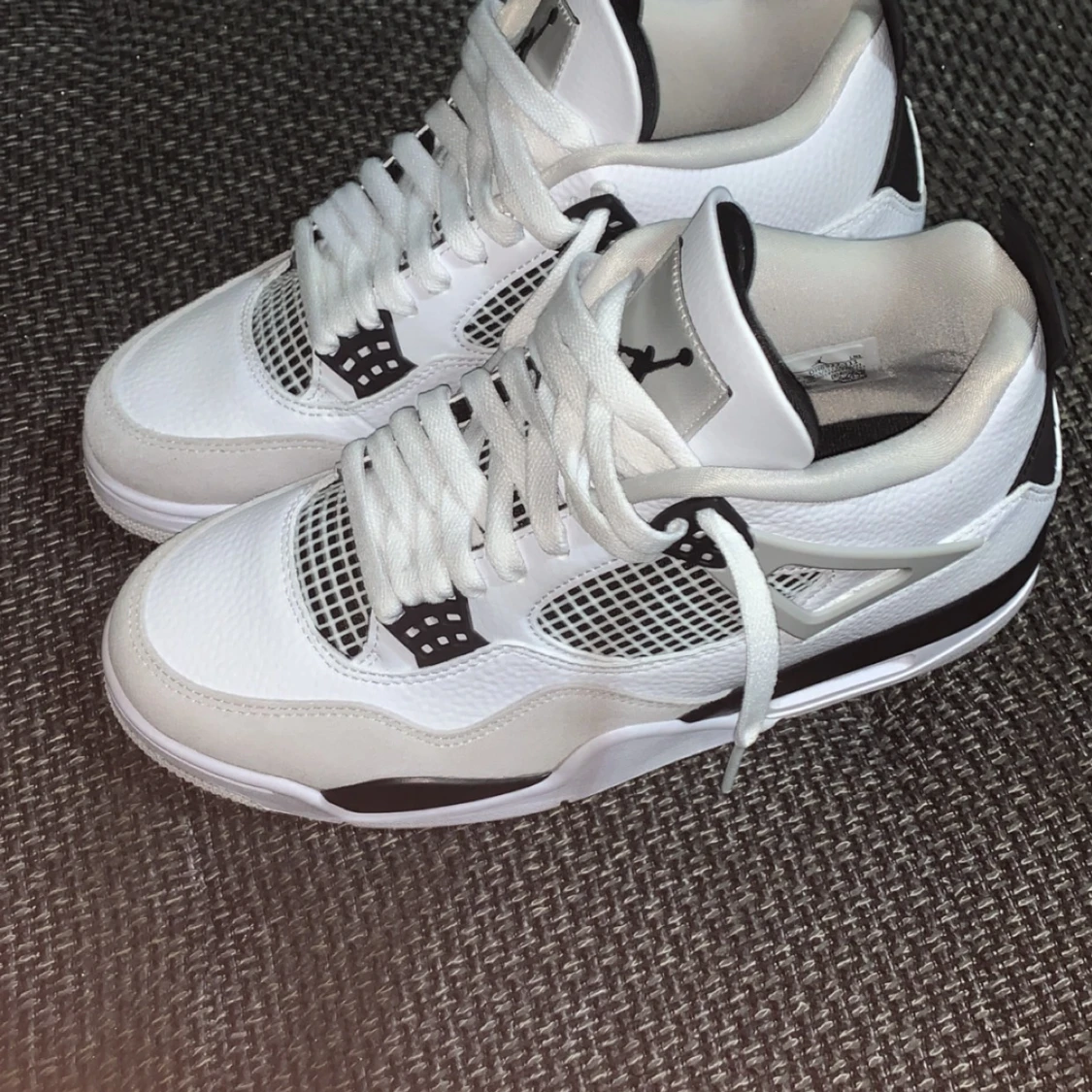 Hej säljer mina Jordan 4. Skorna är färgad vit och svart och kallas för univeristy black. Skorna är i storlek 42 men passar 43 och 42. Säljer skorna då jag inte använder dem men skorna är k topnotch skick, skulle även kunna säga att dem är nya.
