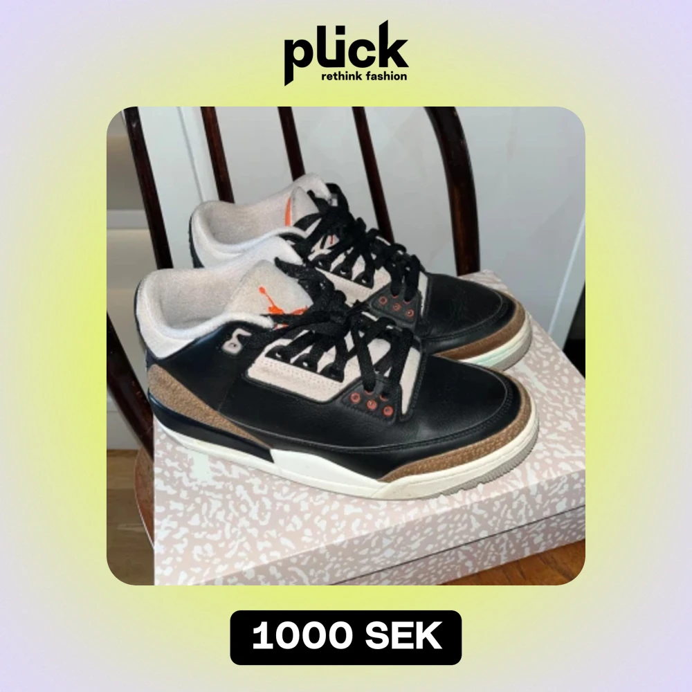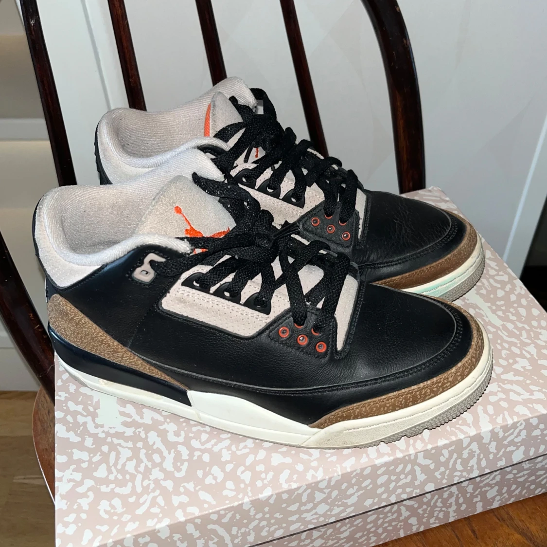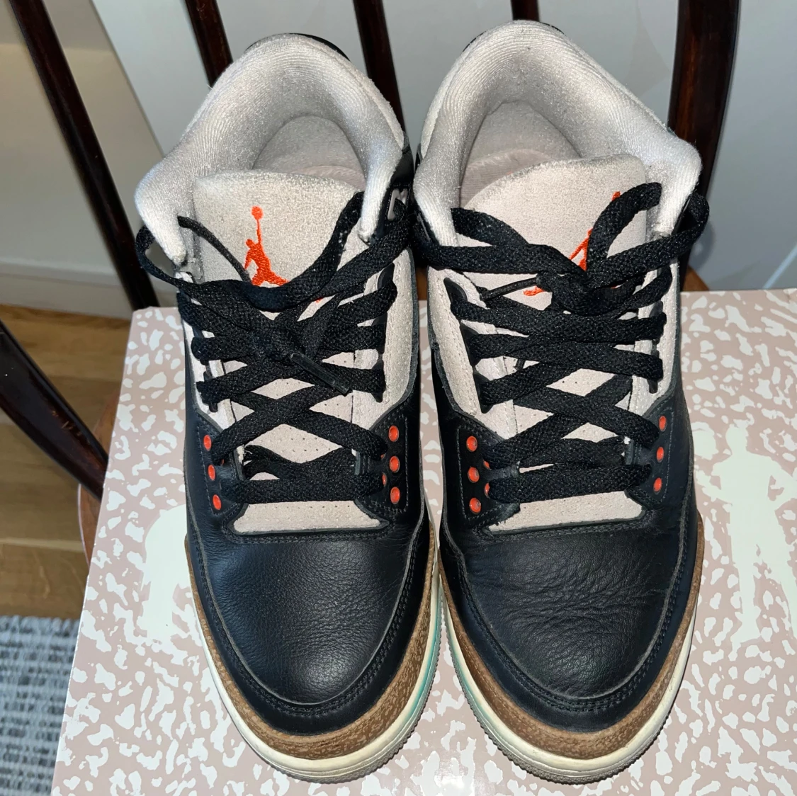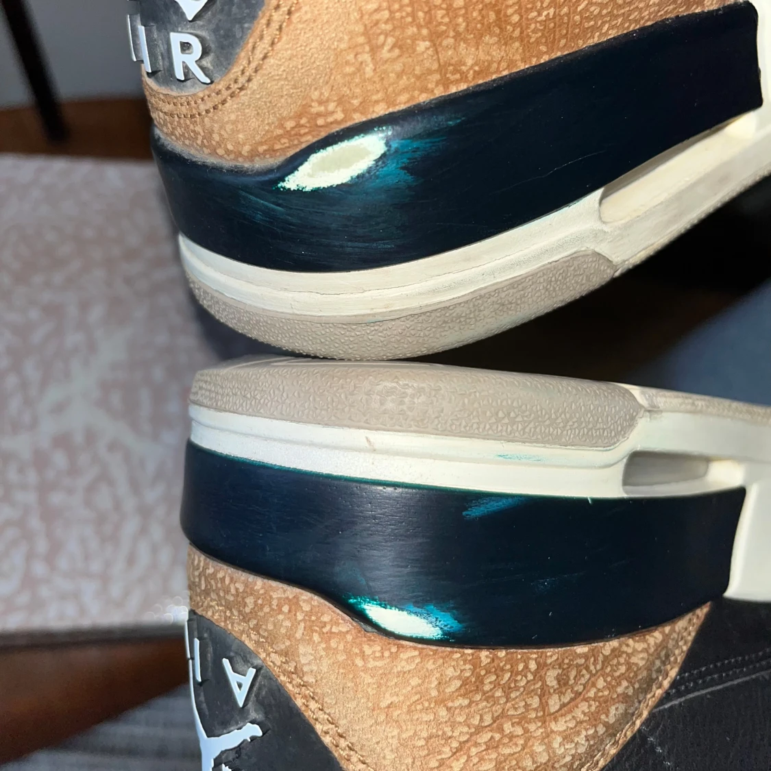 Jordan 3 Desert Elephant, defekter som visas på de två sista bilderna, därav priset. Köpta på SNKRS.