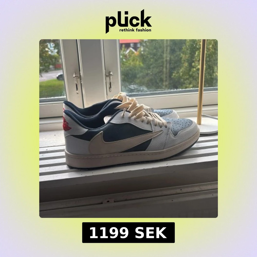 Nike Air Jordan 1 Low Travis Scott med ikonisk omvänd swoosh. Skorna har en mix av vitt och mörkblått skinn, beige detaljer och röda broderade loggor på hälen. Perforerad tå och klassisk snörning. Perfekta för dig som gillar streetwear och sneakers med hype.