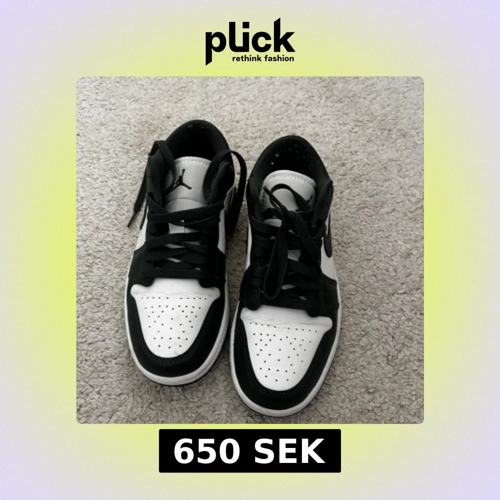 Säljer ett par Nike Air Jordan 1 Low i svart och vitt. Klassisk siluett med svart läderdetaljer, vit tåbox och sula, samt svarta snören. Ikonisk Jumpman-logga på plösen. Perfekta för dig som gillar streetstyle och sneakers med attityd.