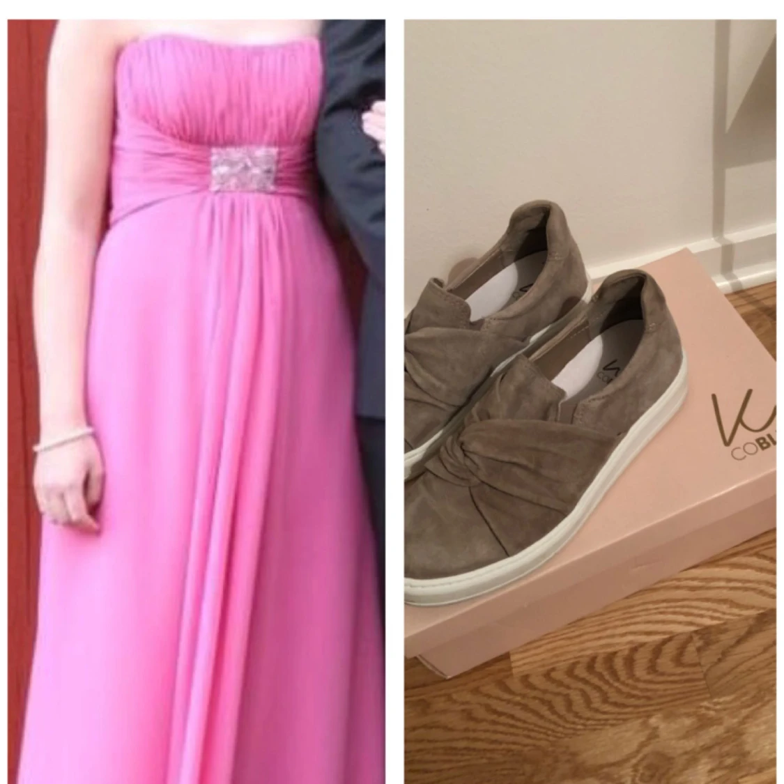Kelsey Rose balklänning i rosa färg. Stl 8. Mycket fin klänning. 300kr K.Cobler vårskor i ljusgrått, aldrig använda mer än testade inomhus, kartong, kvitto och skoputs medföljer. 500kr. Stl 36