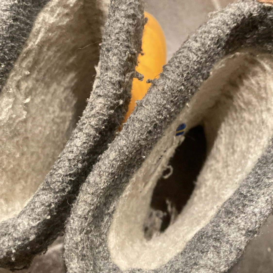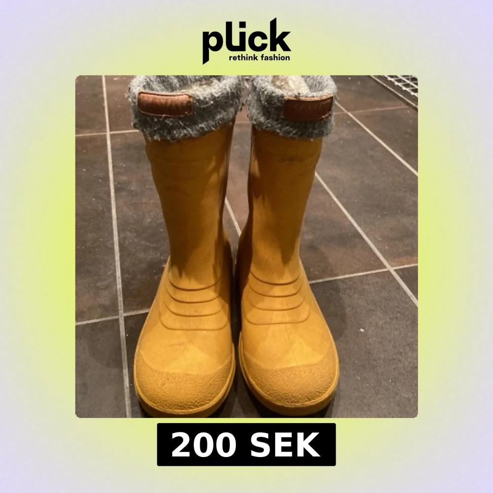 Säljer ett par gula stövlar med grov sula och grått, mjukt foder upptill. Stövlarna har en rund tå och är tillverkade i syntetmaterial med detaljer i skinn vid kanten. Perfekta för regniga dagar och höstväder.