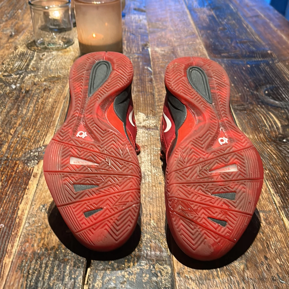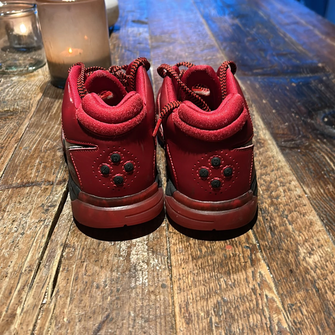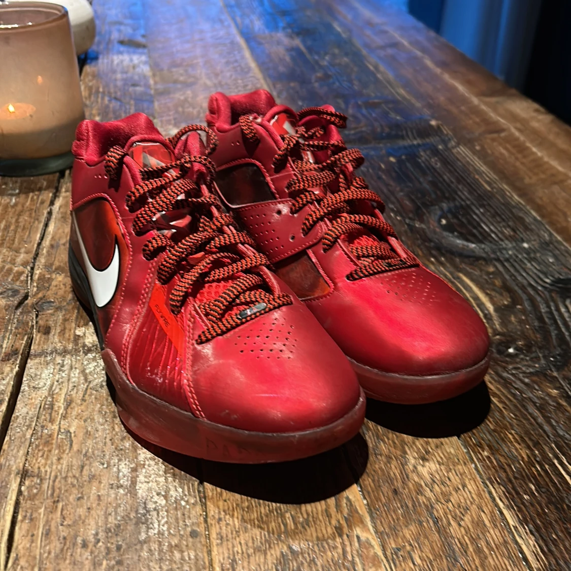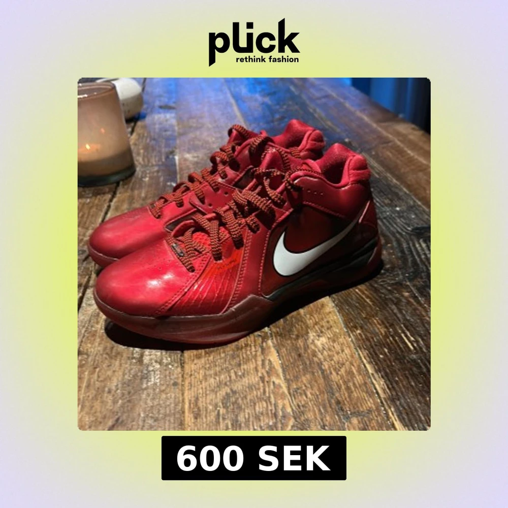 Säljer ett par röda Nike basketskor med vit swoosh på sidan. Skorna har snörning och en platt sula med mönstrad undersida för bra grepp. De har en sportig look och är tillverkade i syntetmaterial.