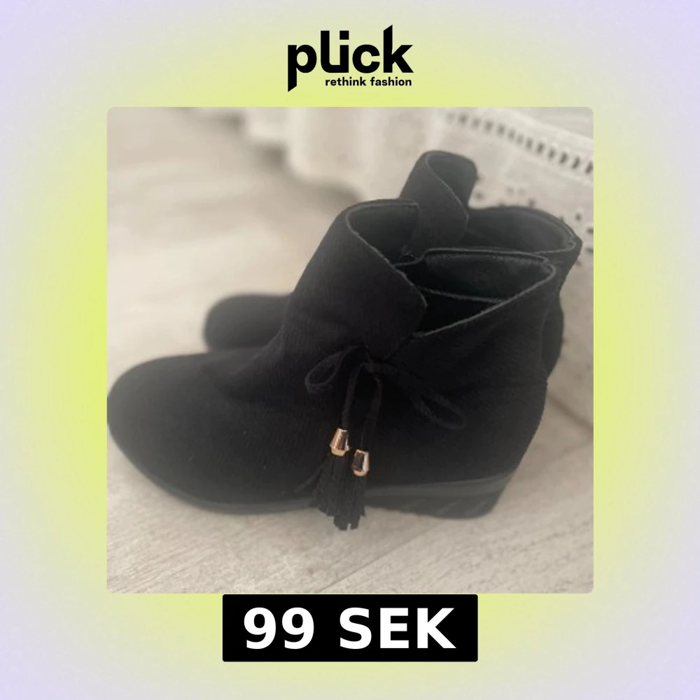 Snygga svarta boots i mocka med kilklack och rund tå. Dekorativa snören med tofsar och guldfärgade detaljer på sidan. Sulan är platt och mönstrad för extra grepp. Perfekt för dig som gillar stilrena och trendiga skor.