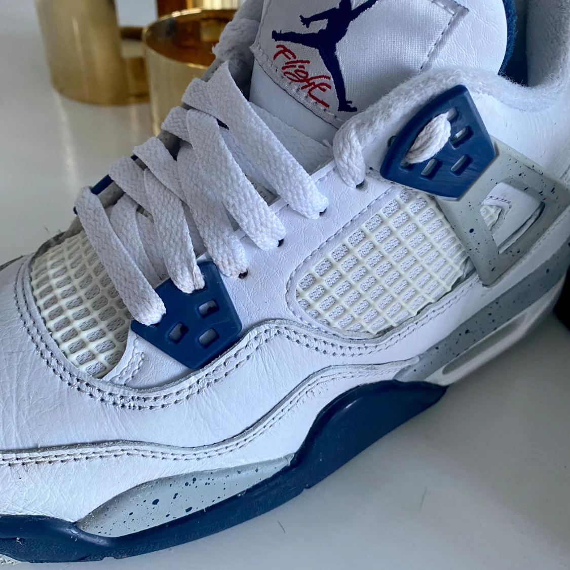 Snygga Nike Air Jordans i vitt med marinblå detaljer. Nypris 4600:- nu 2000:- Storlek 36,5 Fint skick✨