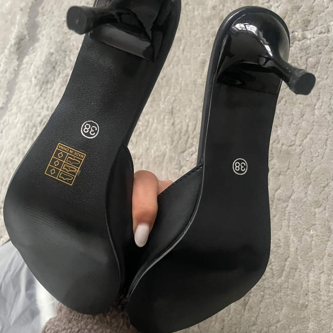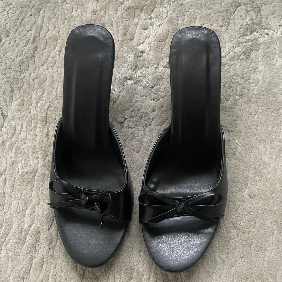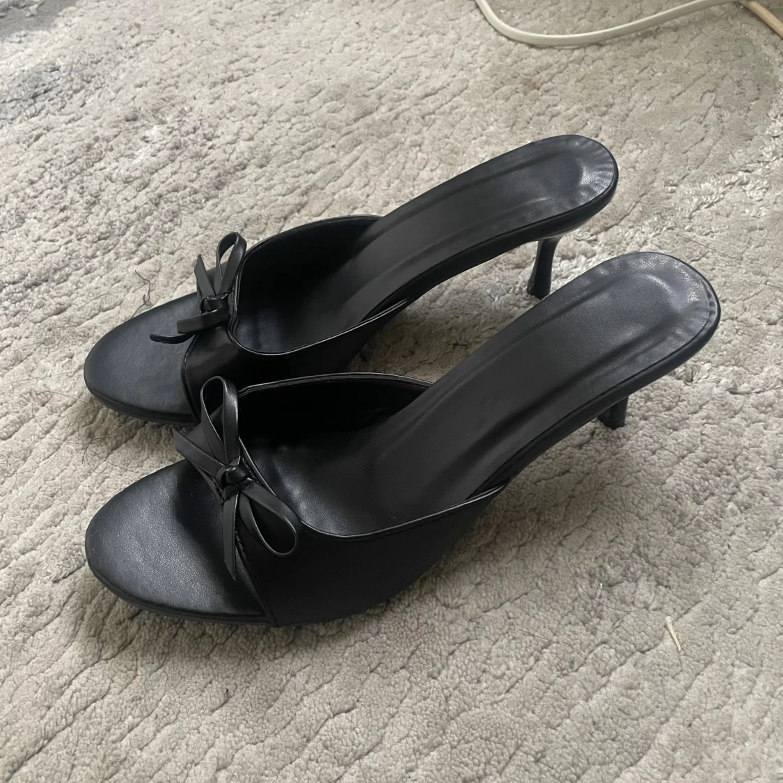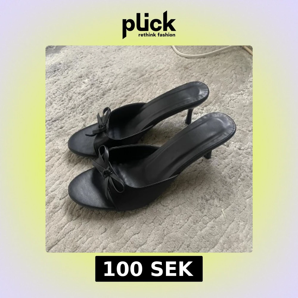 Säljer ett par svarta klackskor med öppen tå och söt rosettdetalj framtill. Skorna har smal klack och är tillverkade i syntetmaterial med en stilren, minimalistisk look. Perfekta för dig som gillar en klassisk och chic vibe.