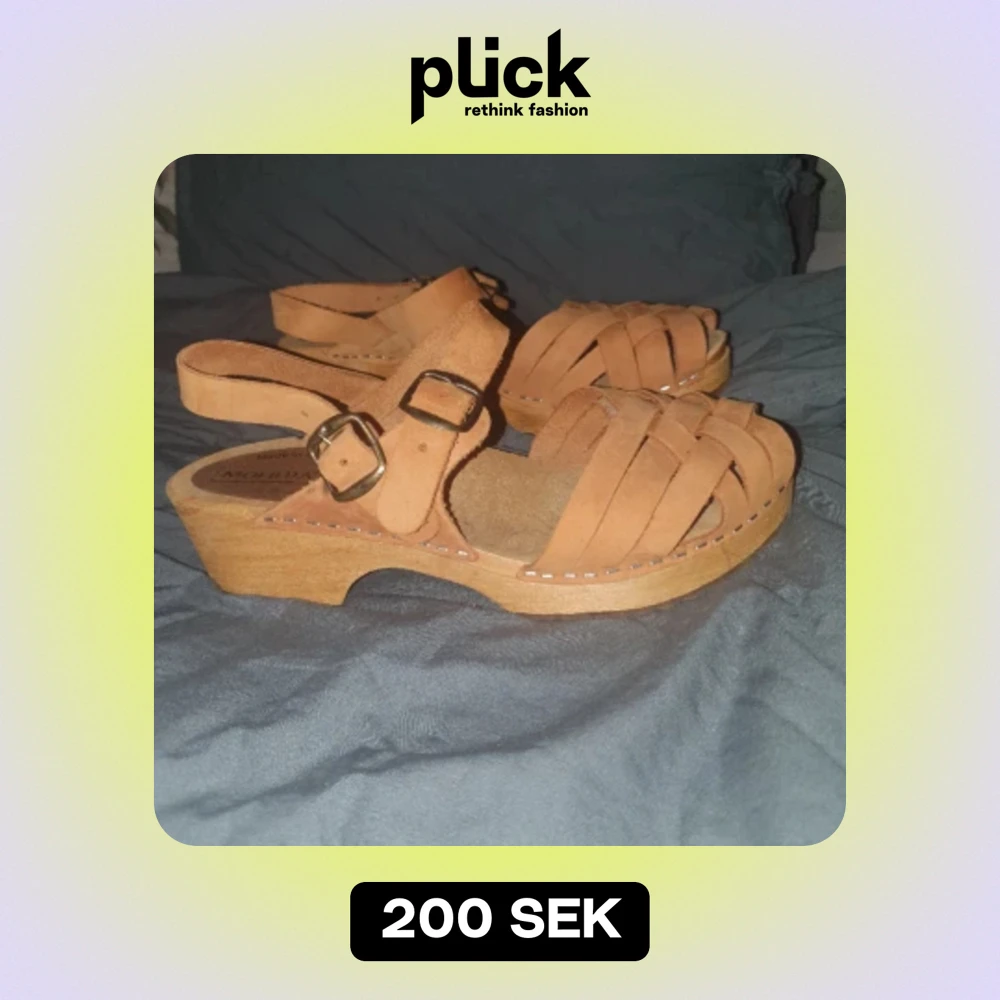 Remmarna i läder och klacken i trä. Klackhöjd ca 4,5 cm. Lite använd. Nypris runt 700 kr