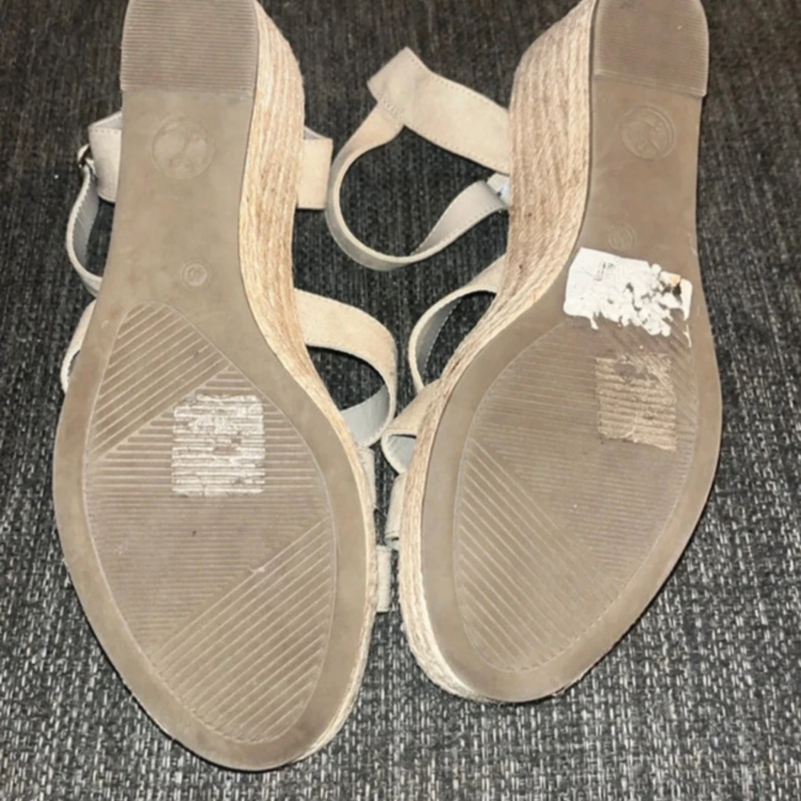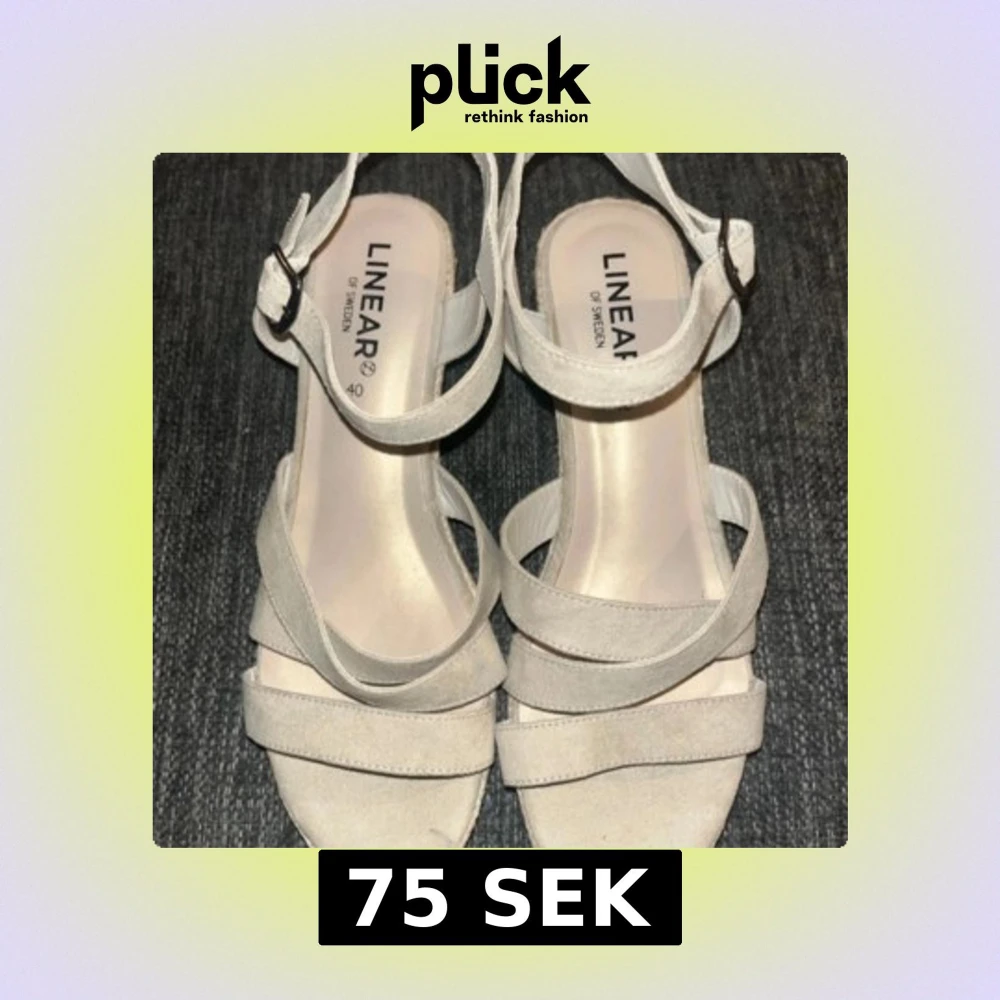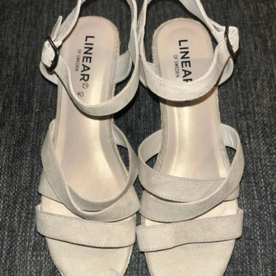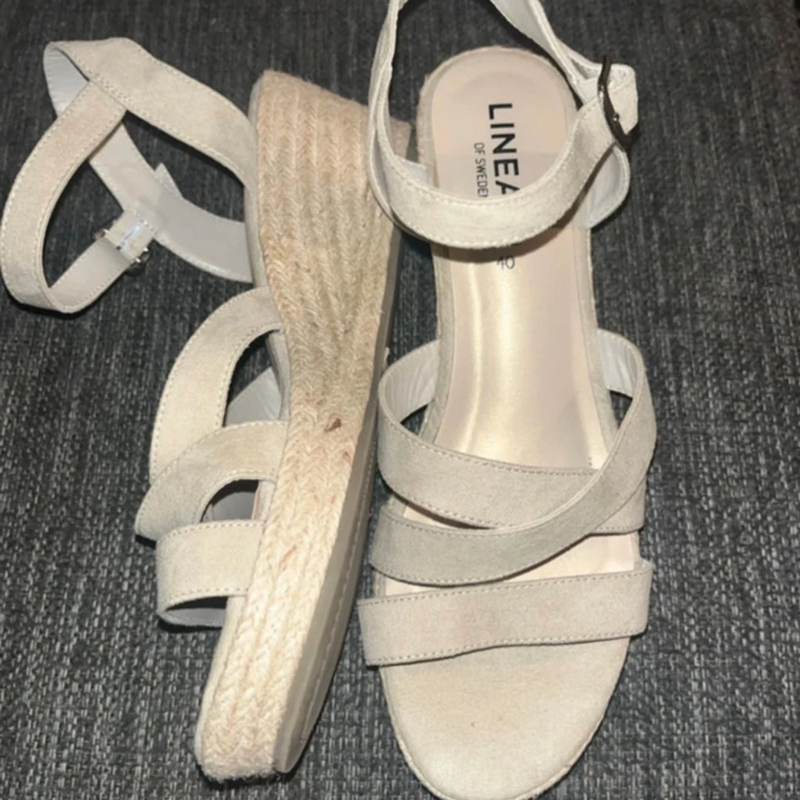 Snygga beige sandaler från Linear of Sweden med flera remmar och justerbart spänne vid ankeln. Skorna har en trendig kilklack i repimitation och ovandel i mockaliknande material. Perfekta för varma dagar och ger en somrig vibe till din outfit.Använda en gång
