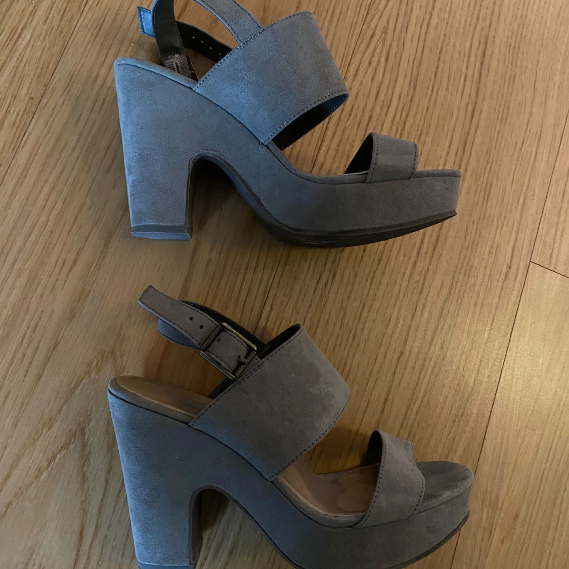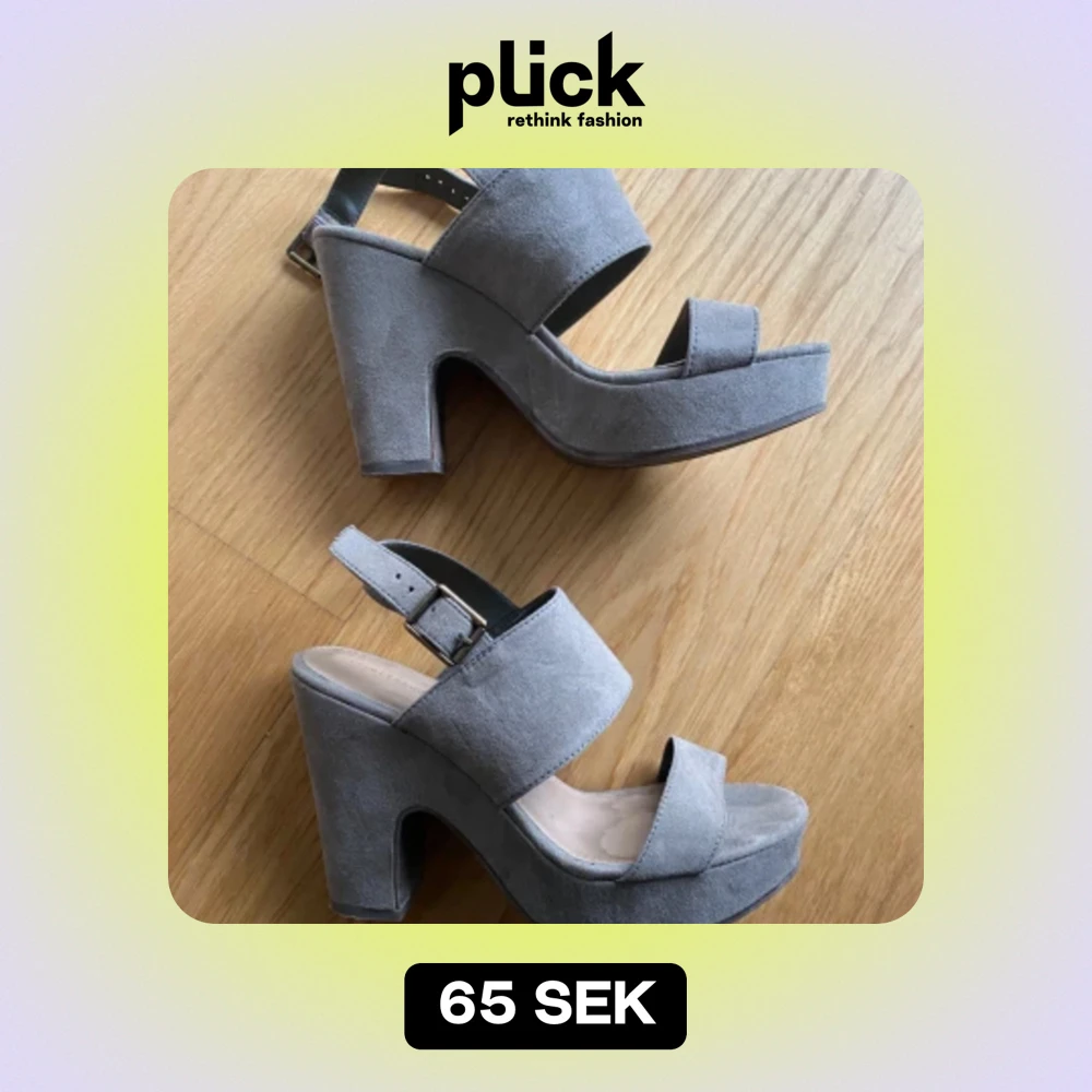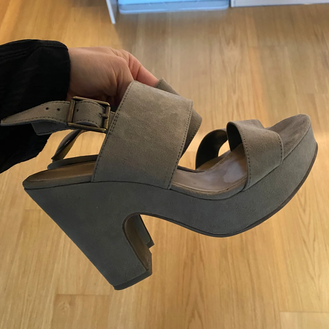Khakifärgade klackskor/sandaletter, hög platå vilket gör dom bekväma att gå i. Hälrem som går att justera. Färgen är khakigrön, syns bäst på sista bilden.