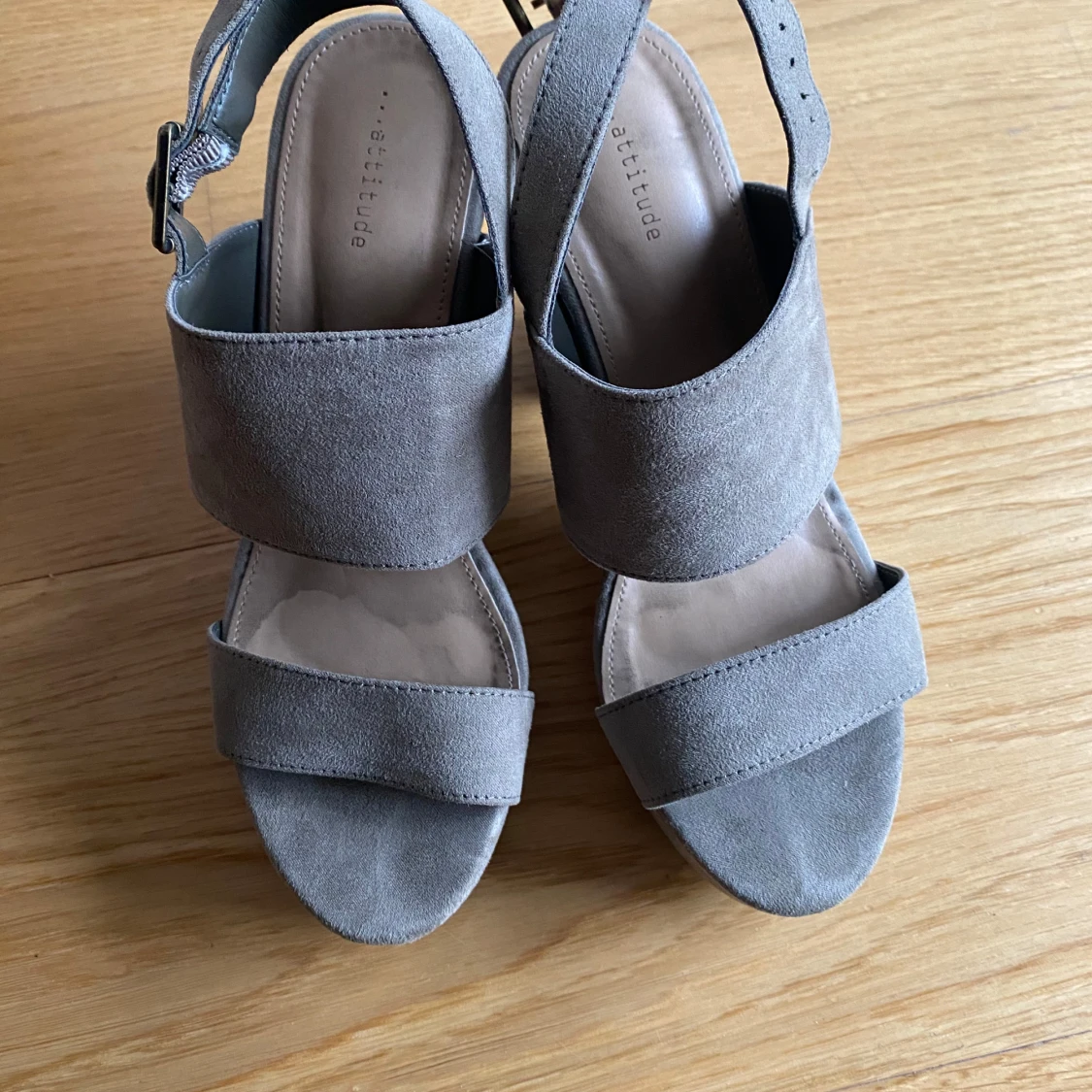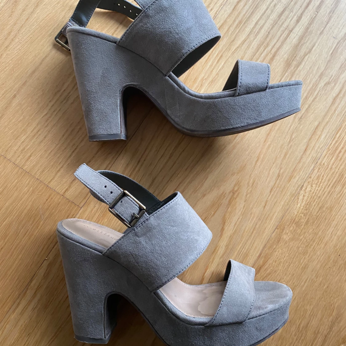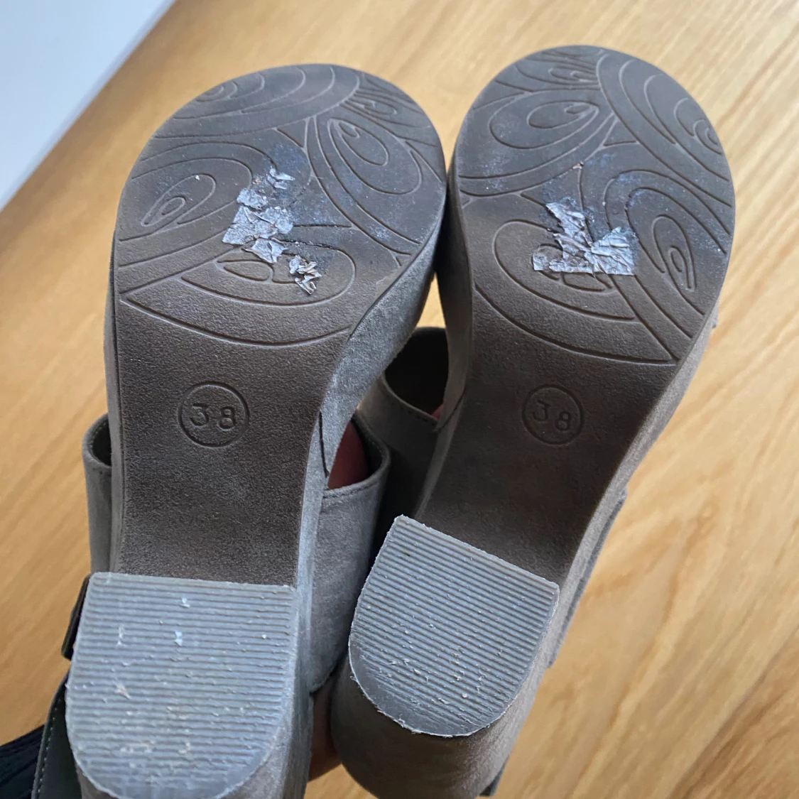 Khakifärgade klackskor/sandaletter, hög platå vilket gör dom bekväma att gå i. Hälrem som går att justera. Färgen är khakigrön, syns bäst på sista bilden.