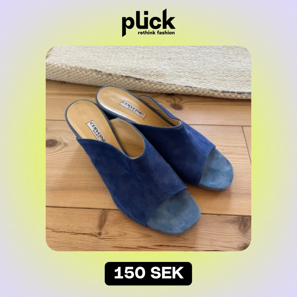Världens gulligaste klackar köpta second hand i Biarritz. Storlek 37, rätt låg klack. Mocka-liknande material i klarblå färg. Lite små på mig som har 25cm i fotmått.