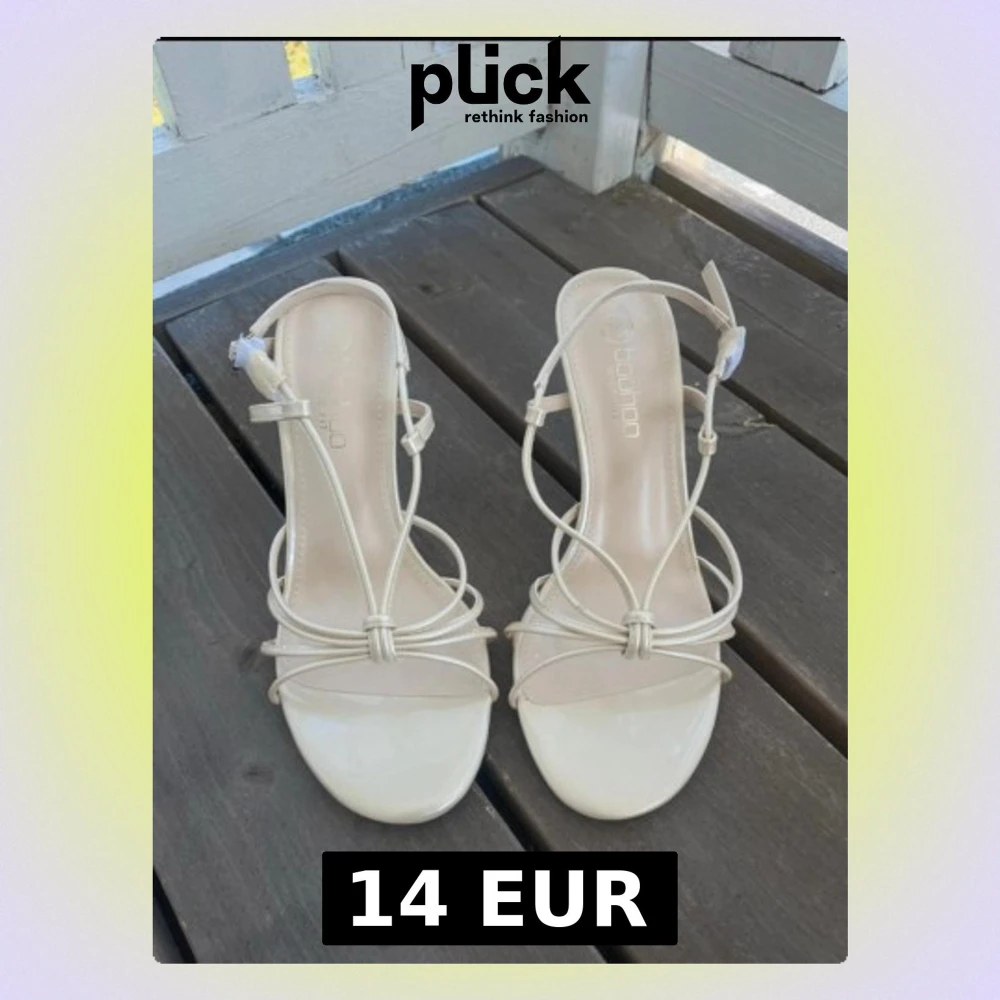 Snygga beige sandaler med smala remmar och öppen tå från Boohoo. Skorna är breda och klacken är 9,5cm. Helt nya och oanvända! Perfekt till sommaren