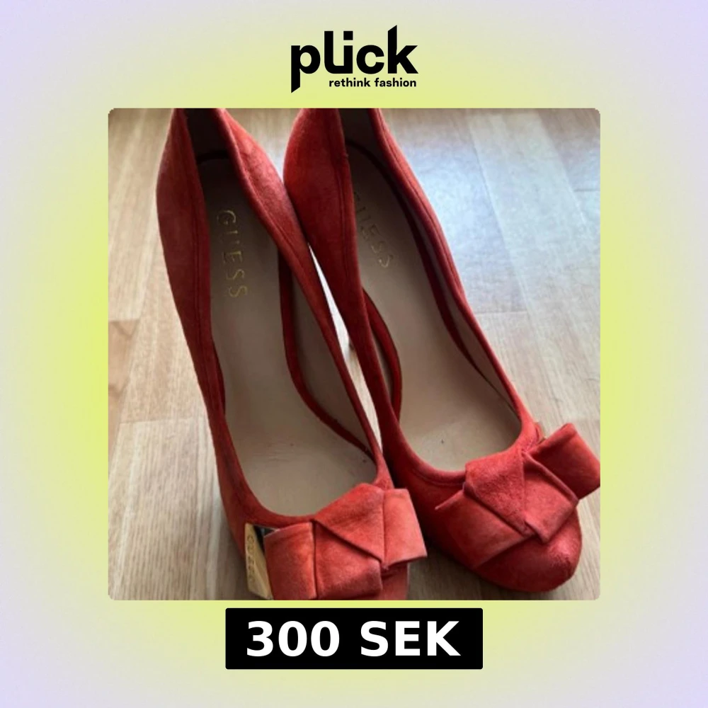 Säljer ett par snygga röda klackar Guess i mjuk mocka. Skorna har en elegant rosett framtill och spetsig tå. Helt nya