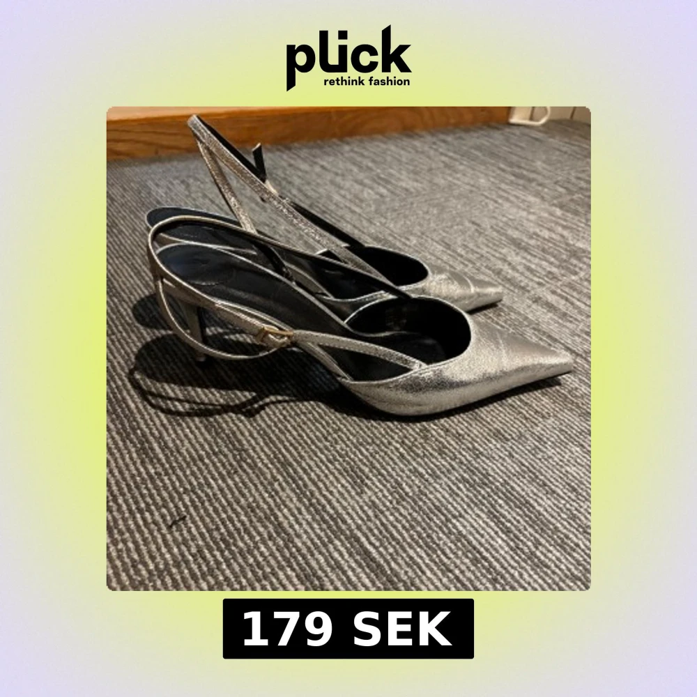(Använda ENDAST en gång!) Säljer ett par glansiga silvriga pumps med smal klack och spetsig tå. Skorna har öppen häl och smala remmar med spänne för en snygg och elegant look. As snygga och trendiga från H&M.