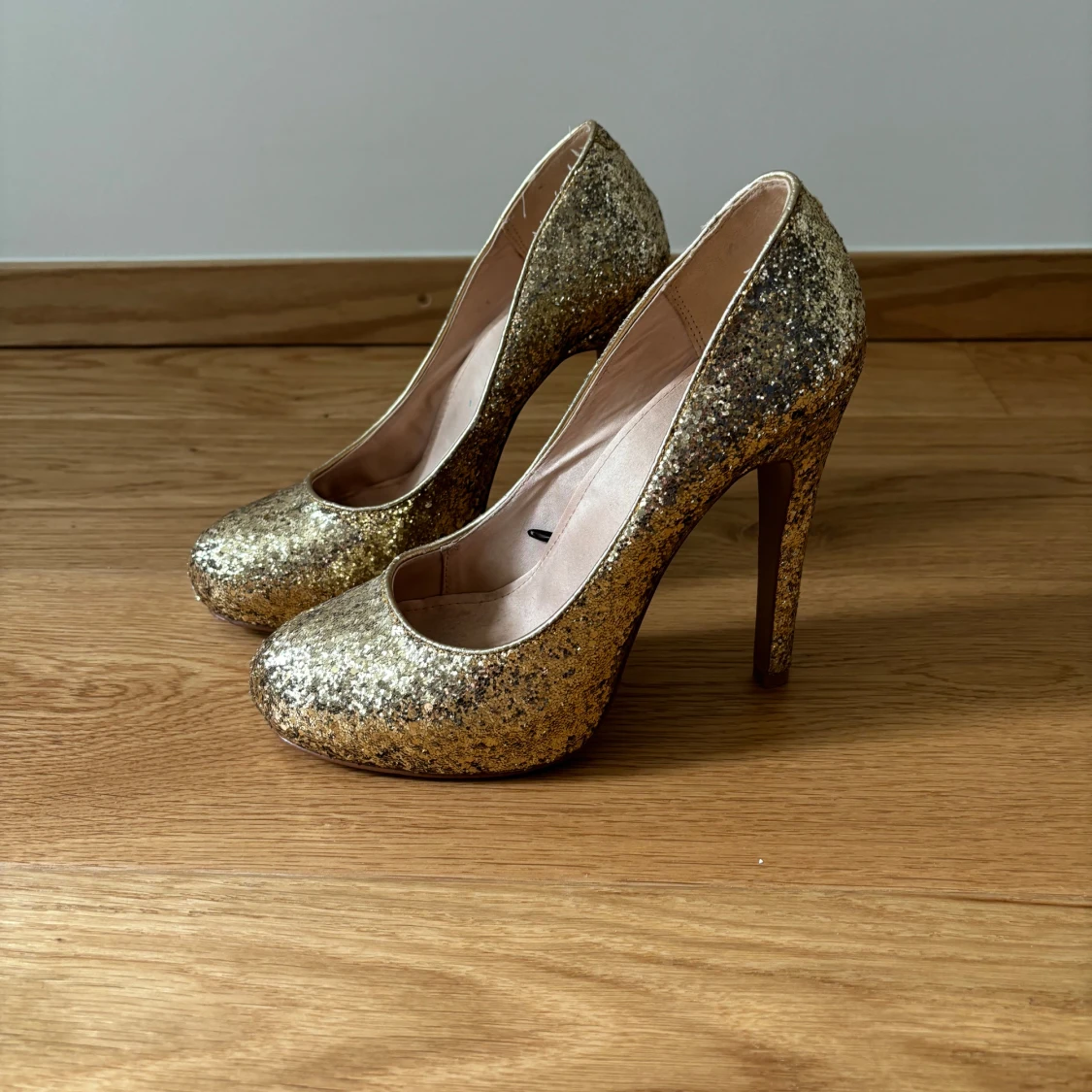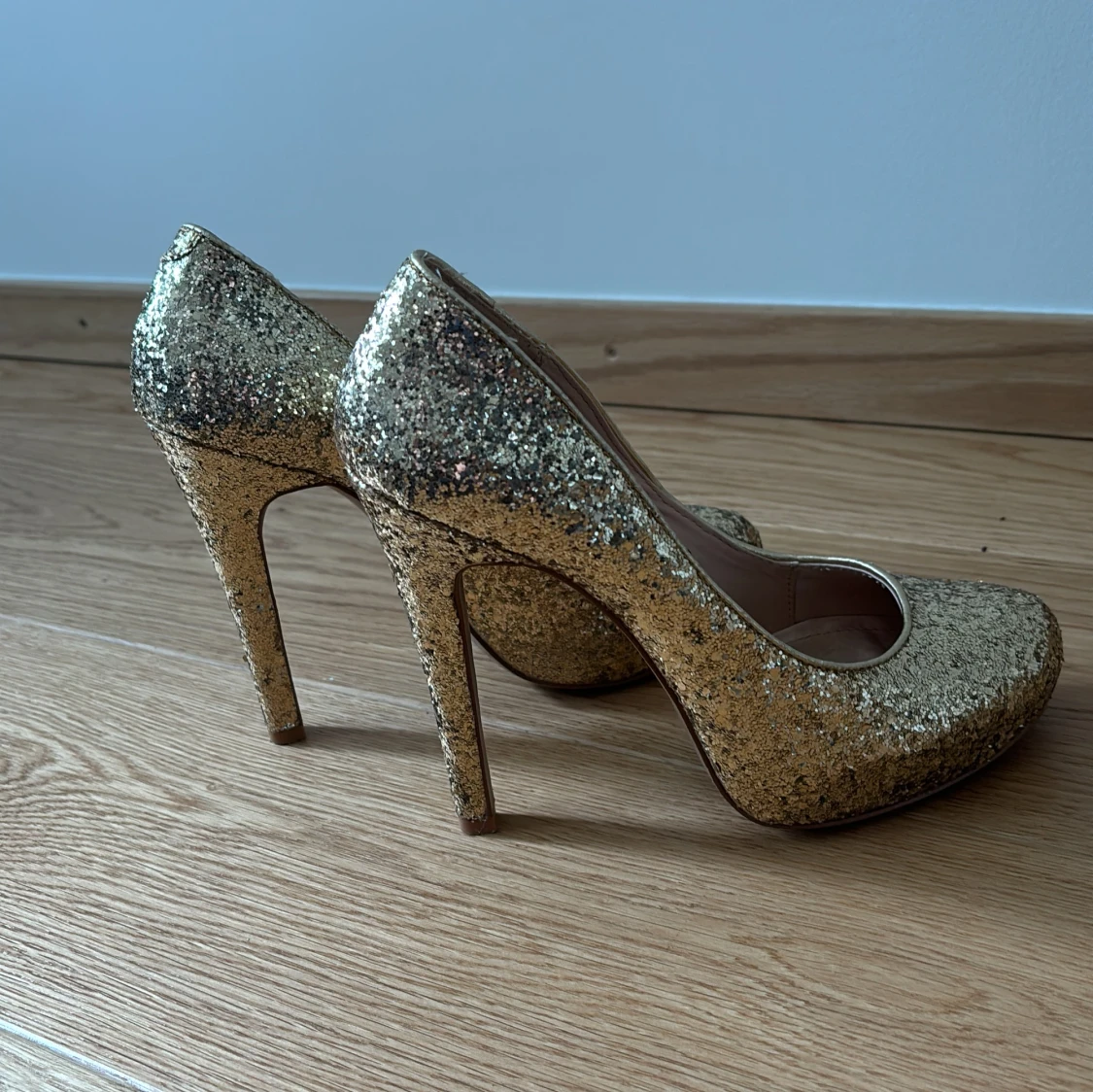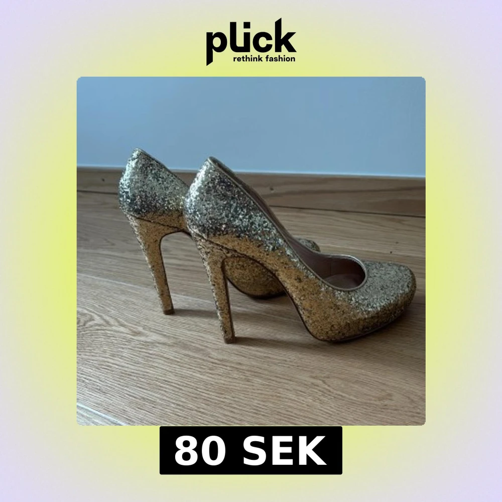 Säljer ett par guld glittriga hög klackar. Okej skick. Har för det mesta stått i garderoben.
