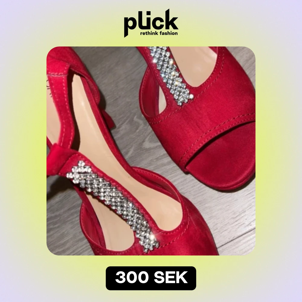 Snygga röda klackskor från Catwalk i mocka med glittrande strassdetaljer på remmen. Perfekta för festliga tillfällen! De har en bekväm klack och en öppen tå-design som ger en elegant look. Använt en gång