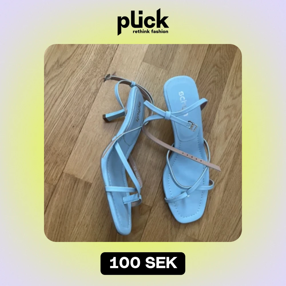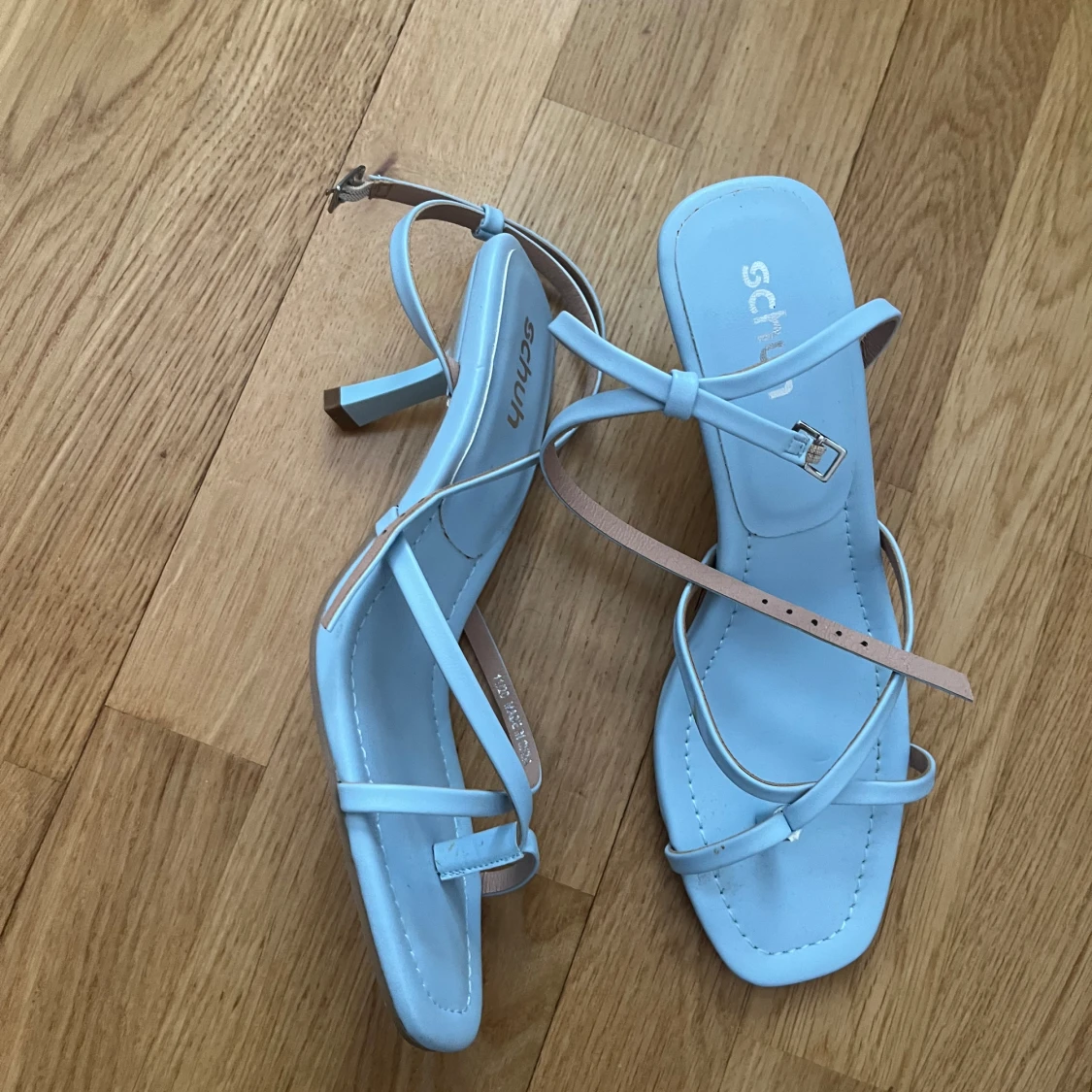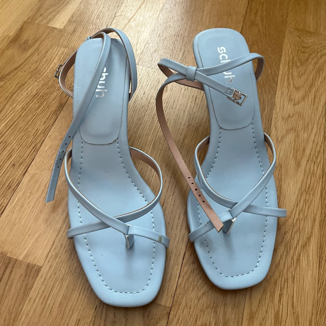 Låga blåa klackskor i storlek 38, ca 5cm klack. Använda en gång men har ett litet märke på remmen vid tårna som syns på bilden.