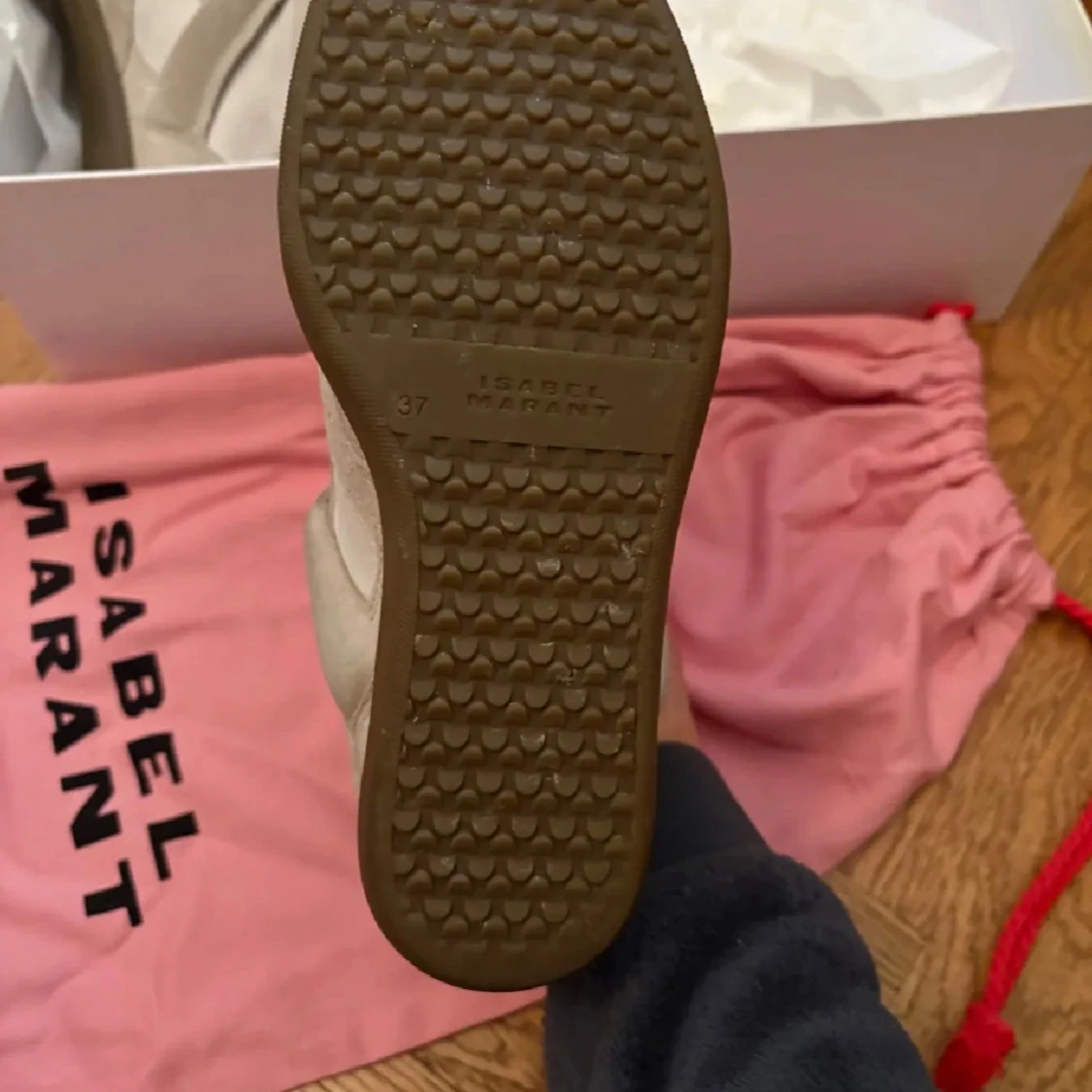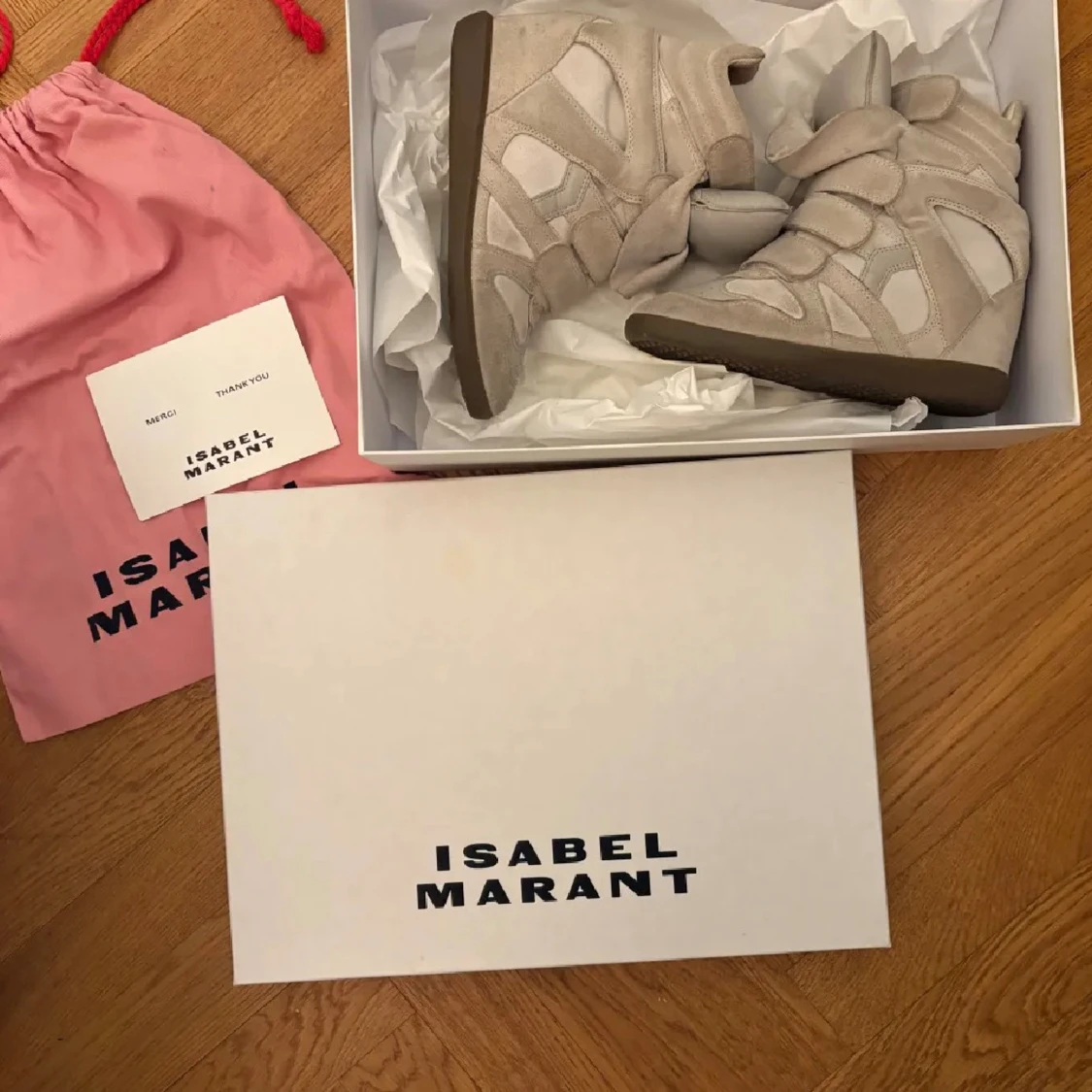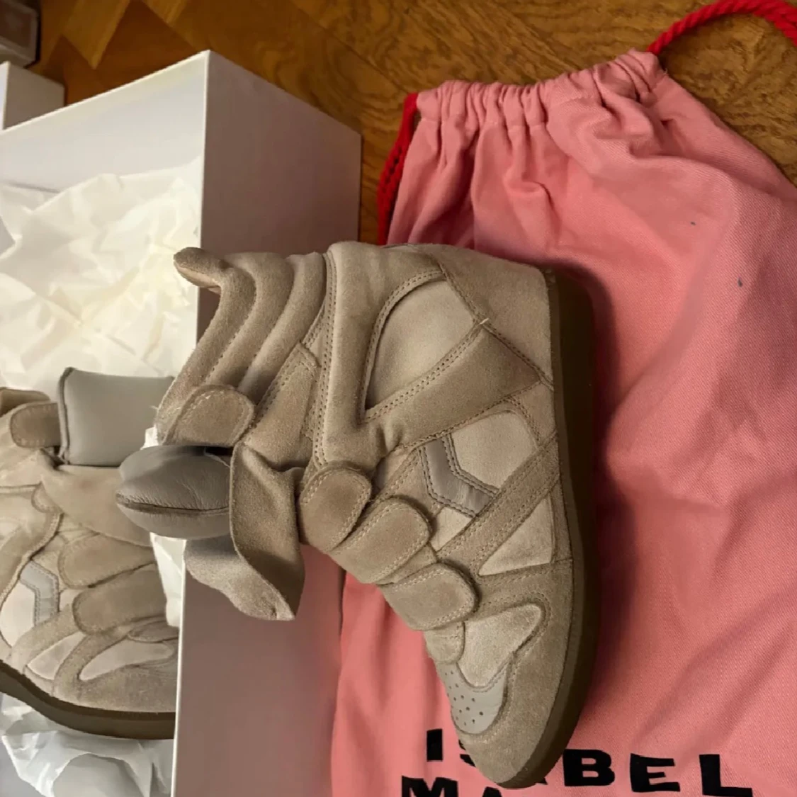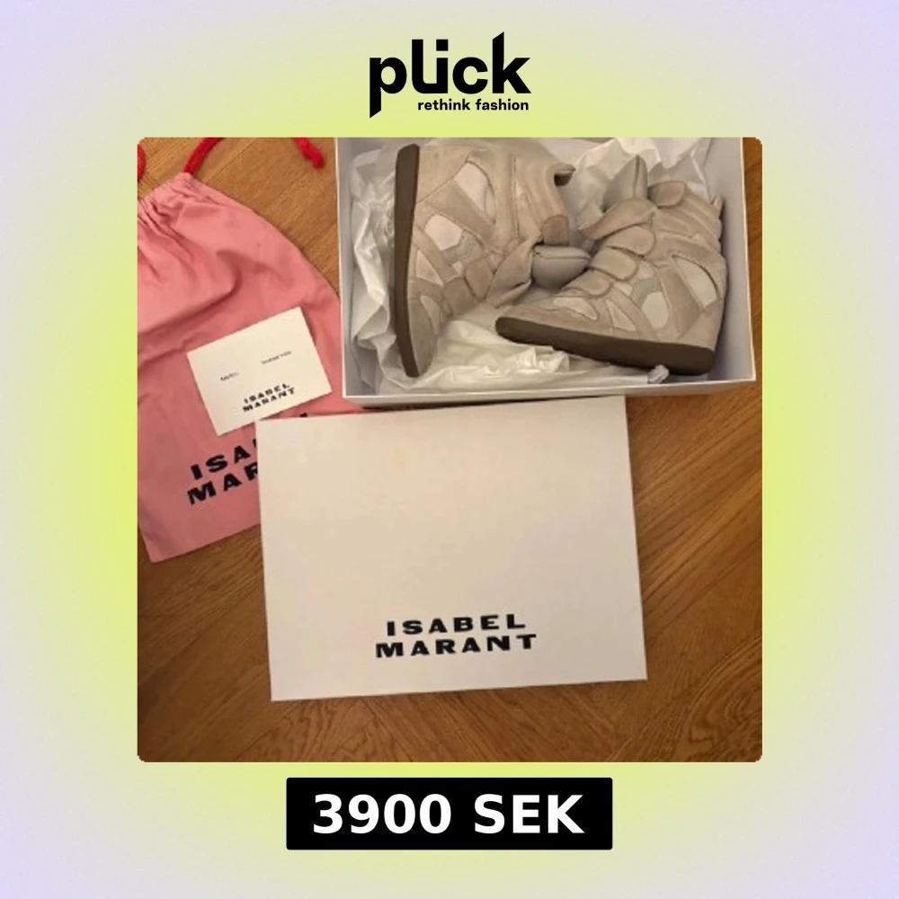Säljer ett par beigea Isabel marants eftersom att de inte kommer till användning!! Det finns en liten röd prick på ena skon som man kan se på tredje bilden, man kan även rengöra skorna om man vill att de ska se nyare ut!❤️ skobox, äkthetsbevis tillkommer även med skorna. De är relativt använda❤️ Storlek 37, går att bude ner priset❤️