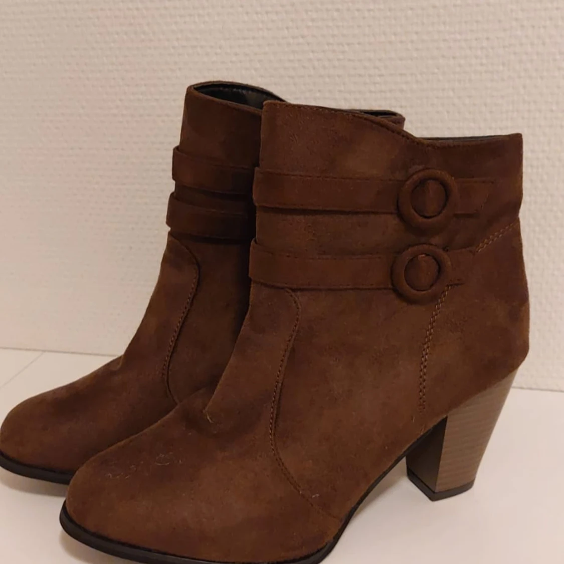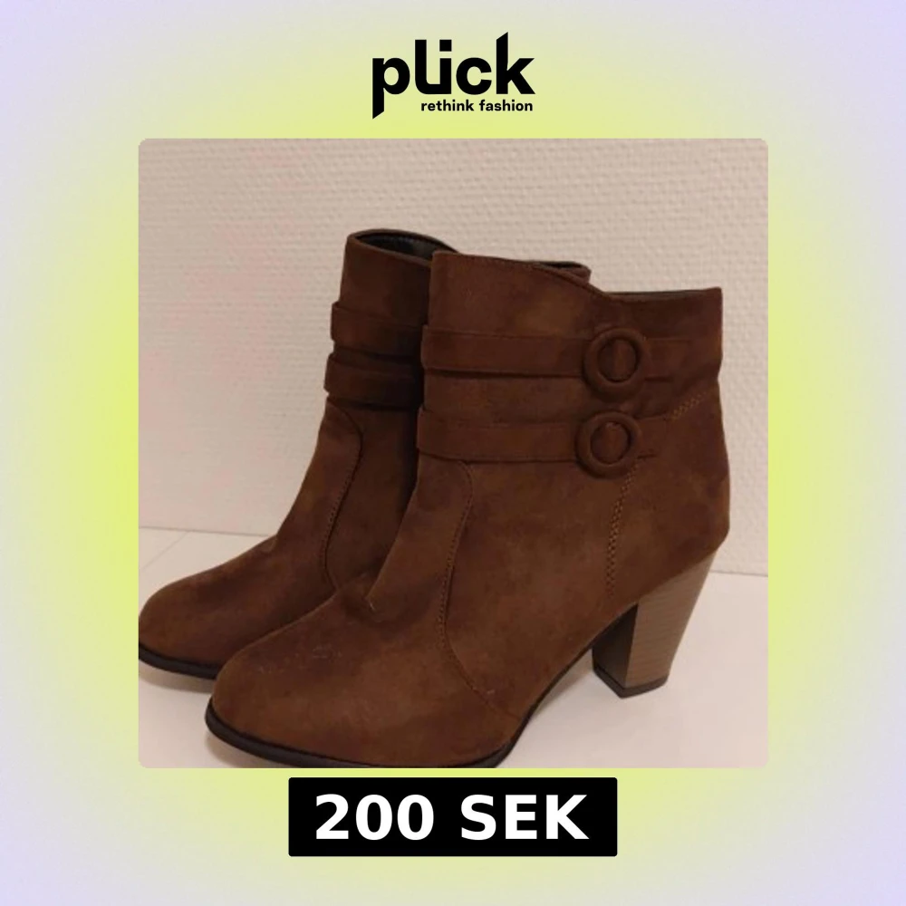 Helt nyskick, oanvända. Snygga bruna stövletter i mocka med markerad klack och dekorativa remmar med runda spännen på sidan. Perfekta för dig som vill ha en stilren och trendig look till hösten eller vintern.