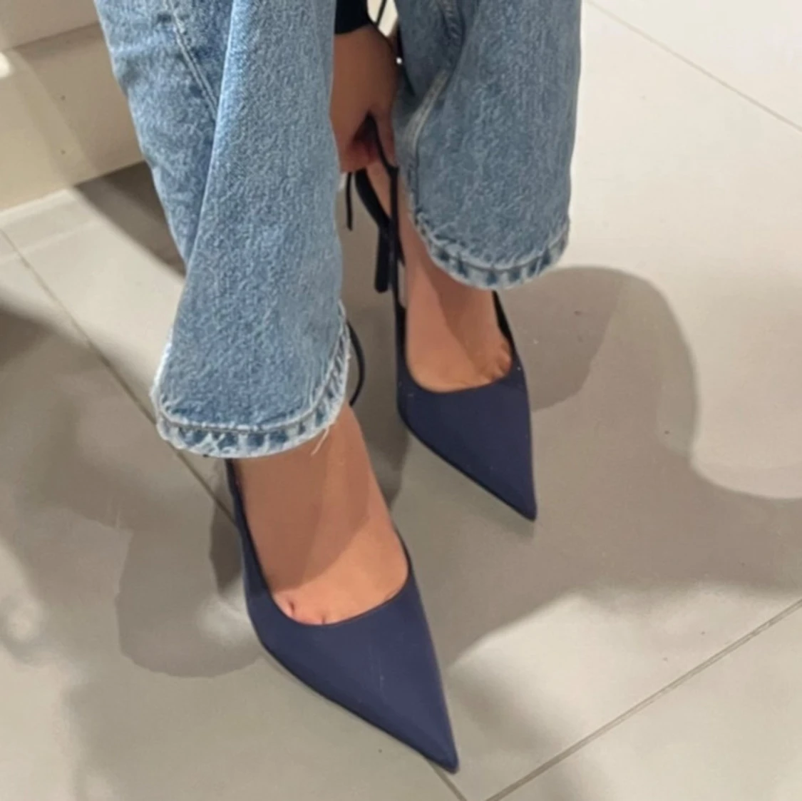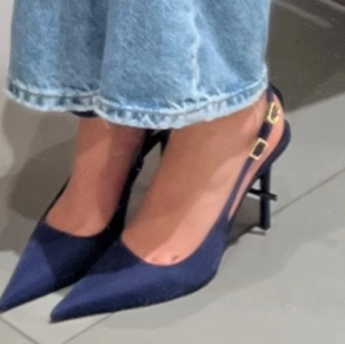 Mörklblå klackar ca 9cm med guldiga detaljer, lätta att gå i, saknar en ”plupp” på ena skon annars i bra skick. Spetsiga fram till och snygg form