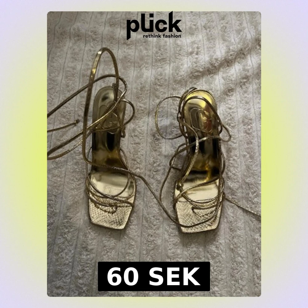 Säljer ett par glammiga sandaletter i guld med smala remmar och snörning som går att vira runt benet. Skorna har fyrkantig tå, hög klack och en snygg ormskinnsstruktur på materialet. Perfekta för att sticka ut och ge en lyxig touch till din outfit.