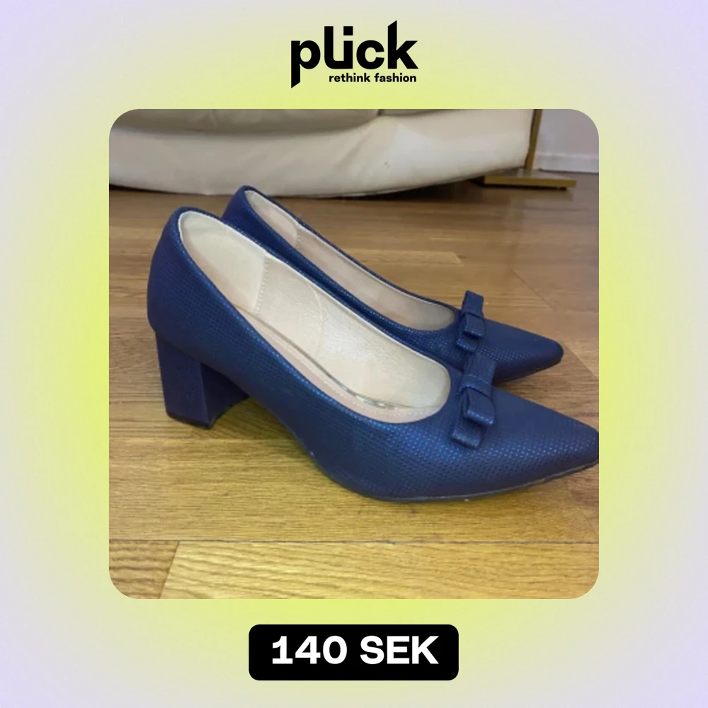 Fina marinblåa skimrande klackskor med en bredare klack på 5 cm. Använda max 4-5 gånger så i väldigt fint skick. Nypris 226 kr