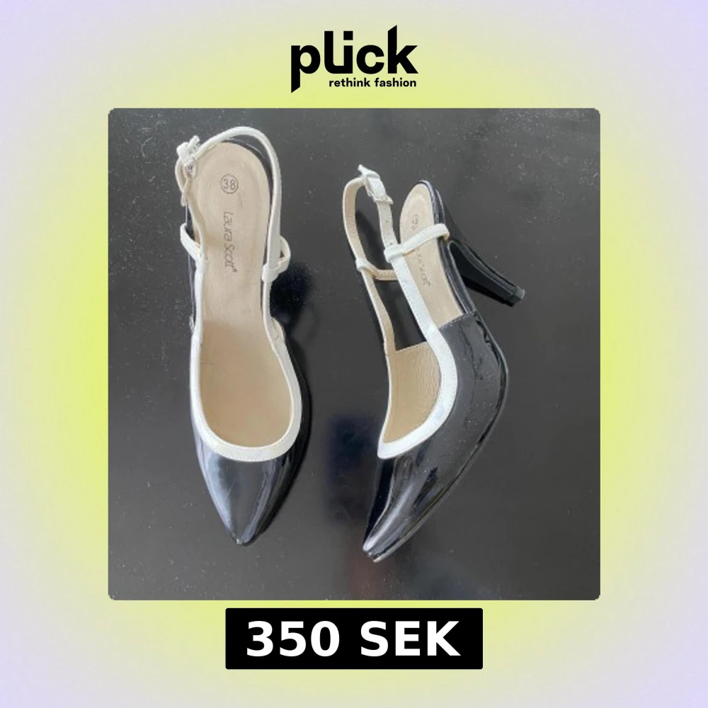 Snygga pumps i svart lack med vita detaljer från Laura Scott. Skorna har spetsig tå, hög klack och justerbar rem runt hälen. Säljer dessa superfina klackar då dem tyvärr börjar bli lite för små…🫣