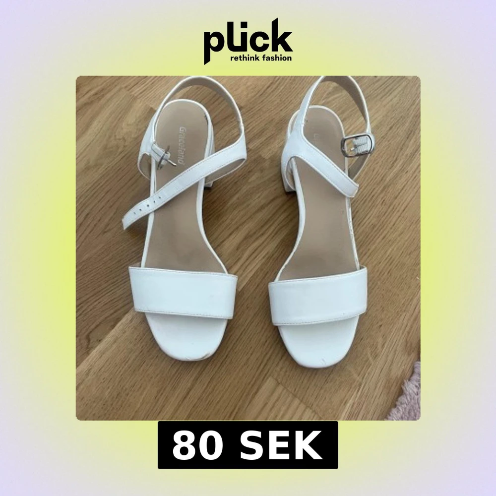 Stilrena vita sandaler från Graceland med bred rem över tårna och justerbart spänne vid ankeln. Skorna har en stabil blockklack och öppen tå, perfekta för en fräsch och modern look. Tillverkade i syntetmaterial med en klassisk design. Storlek 37, 7 cm höga