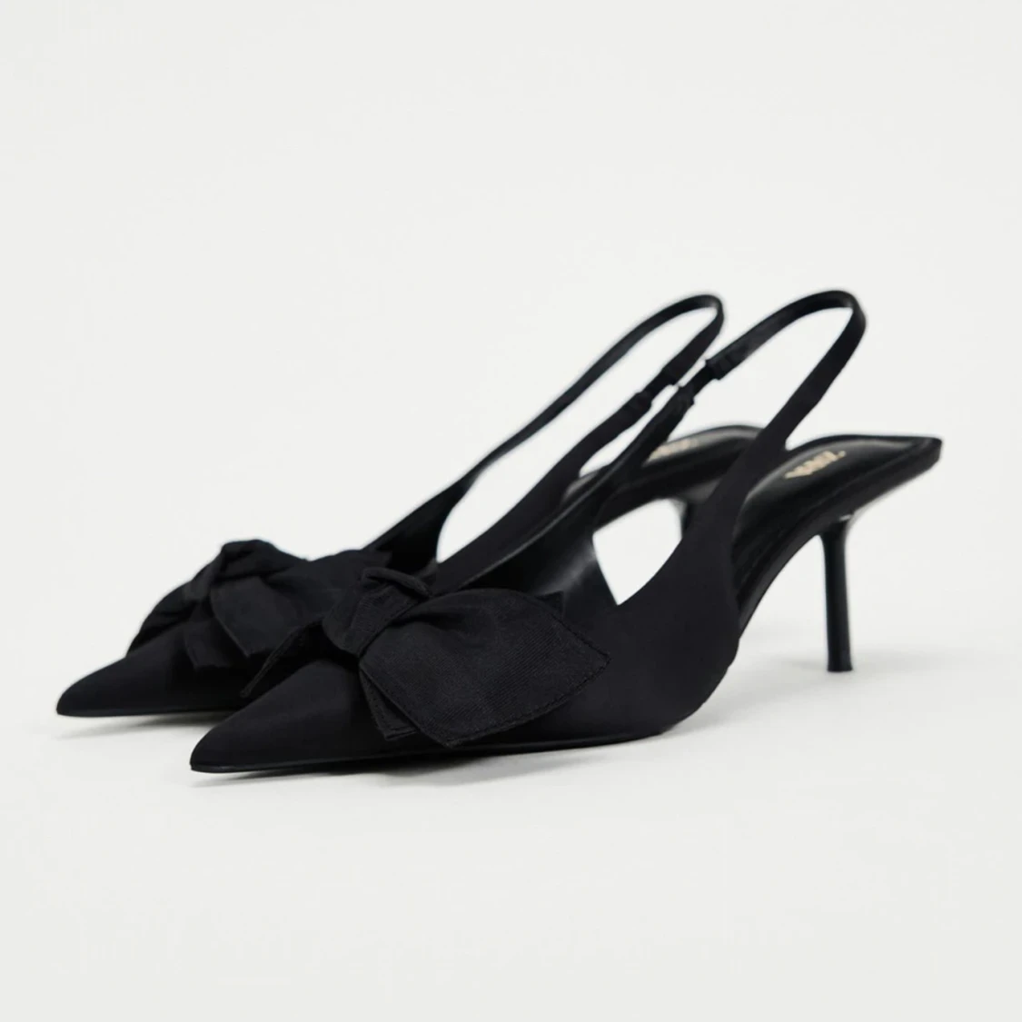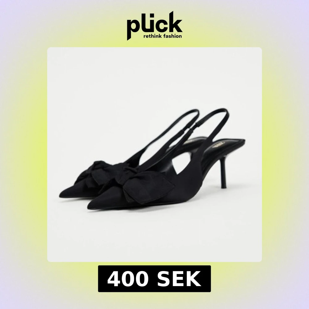 Snygga svarta pumps från Zara med spetsig tå och låg klack. Skorna har en elegant rosettdetalj framtill och en öppen häl med smal rem. Materialet är matt och känns lyxigt, perfekt för dig som gillar stilrena och trendiga skor.