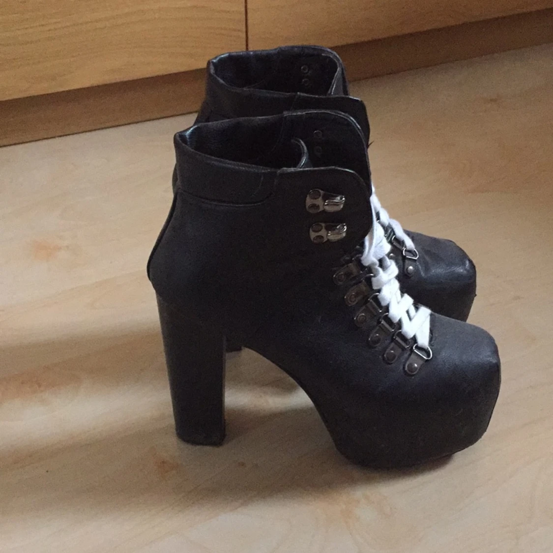 Jeffrey Campbell inspirerade skor (alltså inte "äkta"). Mycket lite använda. Svarta skosnören följde med men har de ej kvar, lätt att köpa nya och byta om man vill. Storlek 36. Mycket sköna att gå i trots höjden på klacken. Nypris 600:- säljes för 100:- OBS! Skickar ej via post. Möts upp i Tullinge/Stockholm