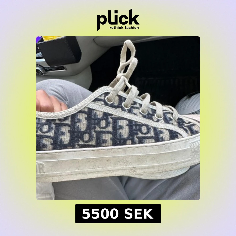 Säljer ett par Dior sneakers i beige och blått med tydligt Dior-monogram över hela skon. Skorna har snörning, rund tå och platt sula. Klassisk och lyxig design med Christian Dior-logga framtill och på insidan. nypris är 11 000kr ❤️