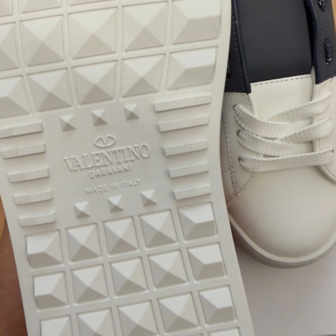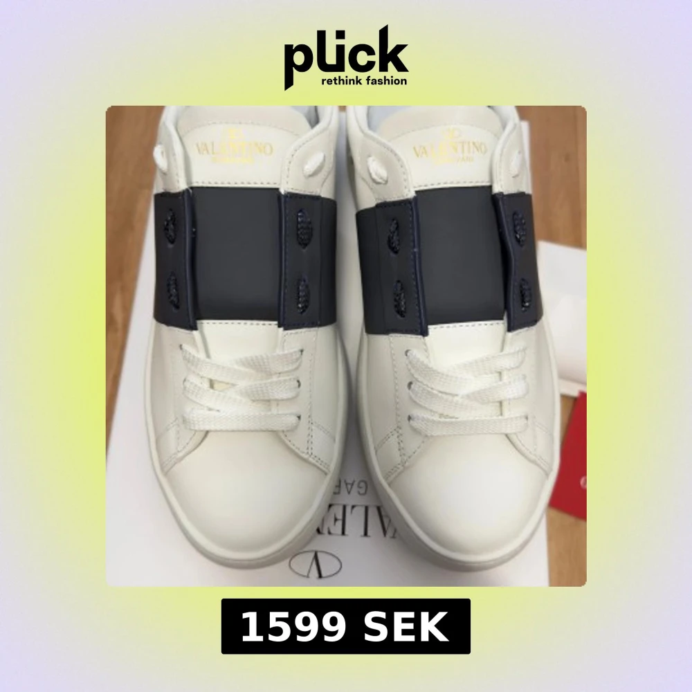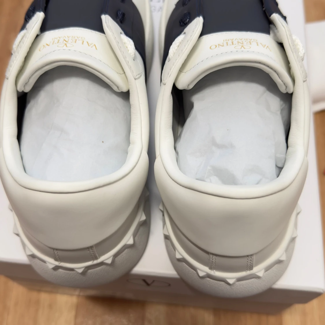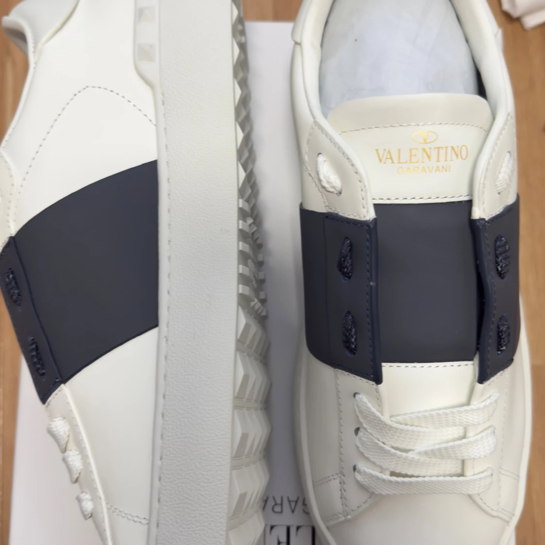 Snygga Valentino Garavani Open sneakers i vitt skinn med bred mörkblå rem över snörningen. Klassisk rund tå, platt sula med pyramidmönster och vita skosnören. Guldlogga på plösen och coola detaljer på hälen. Perfekt för dig som gillar exklusiv streetstyle.