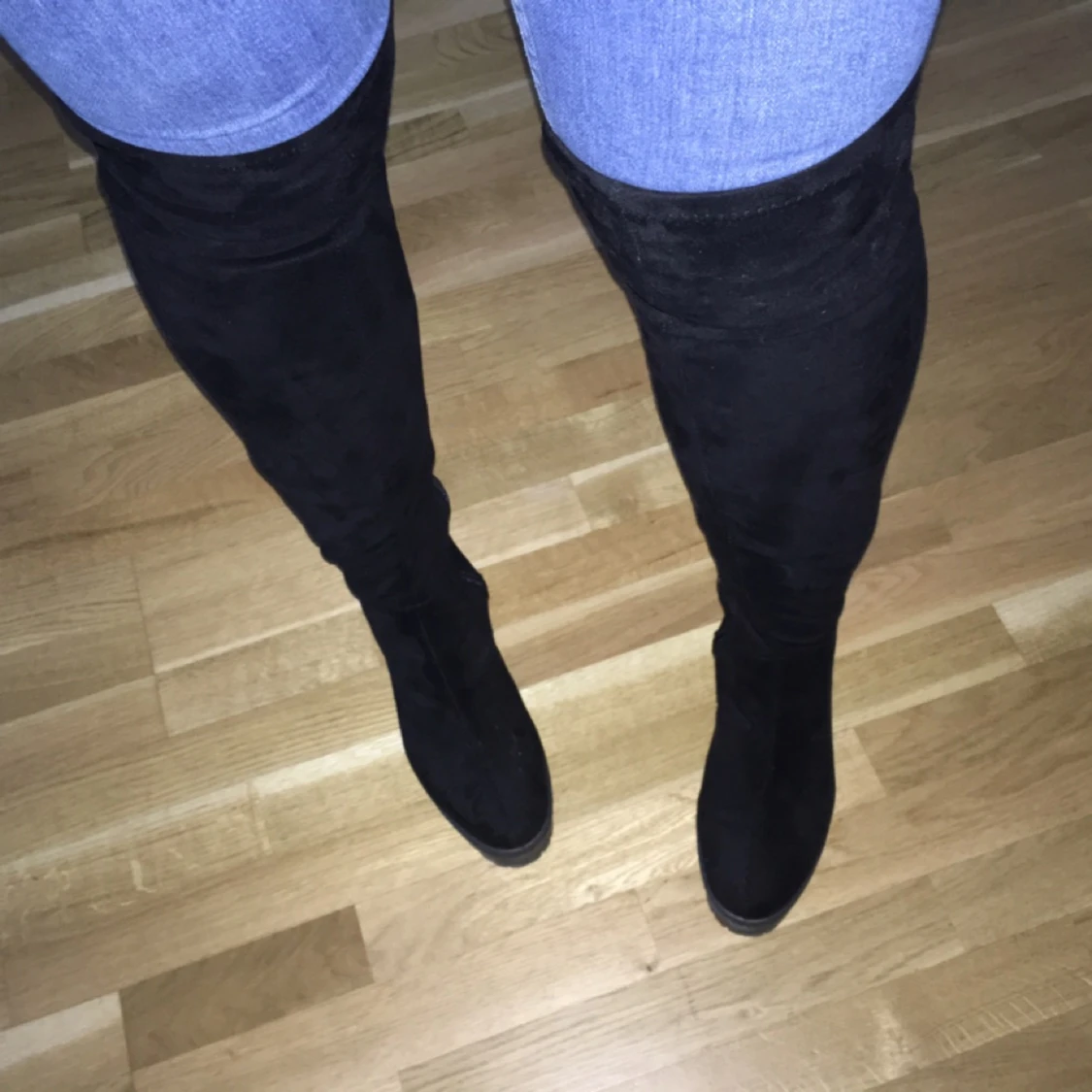 Knähöga stövlar från River Island använda ca 4 gånger! Super fina och bekväma, sitter fast över jeans men om man ska ha tunna strumpbyxor eller på bar hud- så rekommenderas ett par knähöga strumpor för att skorna ska hålla sig kvar över knäna. Nypris ca 900 kr Säljer pga att dem dammar mer än vad dem används.