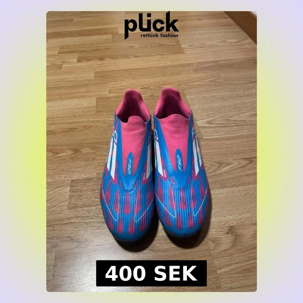 Säljer ett par Adidas F50 fotbollsskor i en riktigt fet färgkombo med blå och rosa mönster. Skorna har en strumpliknande ovandel för skön passform och är designade för snabbhet på planen. Snygga vita detaljer och platt sula för grym kontroll.