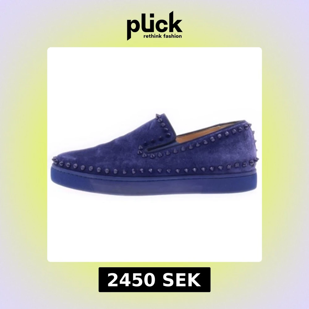 Snygga blå loafers i mocka från Christian Louboutin, dekorerade med nitar runtom. Skorna har en ikonisk röd sula och en rund tå. Perfekta för att ge en edgy touch till din stil.