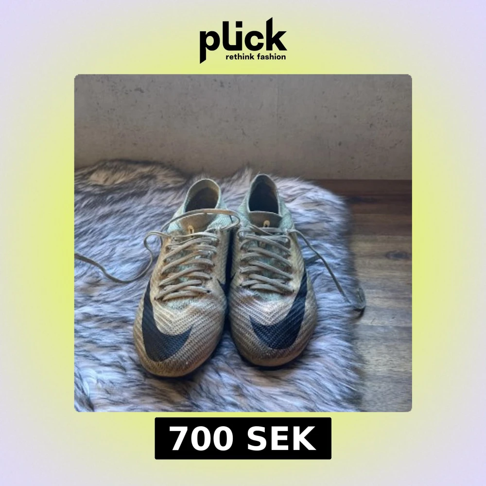 Säljer ett par Nike Mercurial fotbollsskor i beige och svart. Skorna har en snygg design med snörning och är perfekta för fotbollsplanen. De har en spetsig tå och är tillverkade i syntetmaterial för bästa prestanda.(konsgräsdobbar)